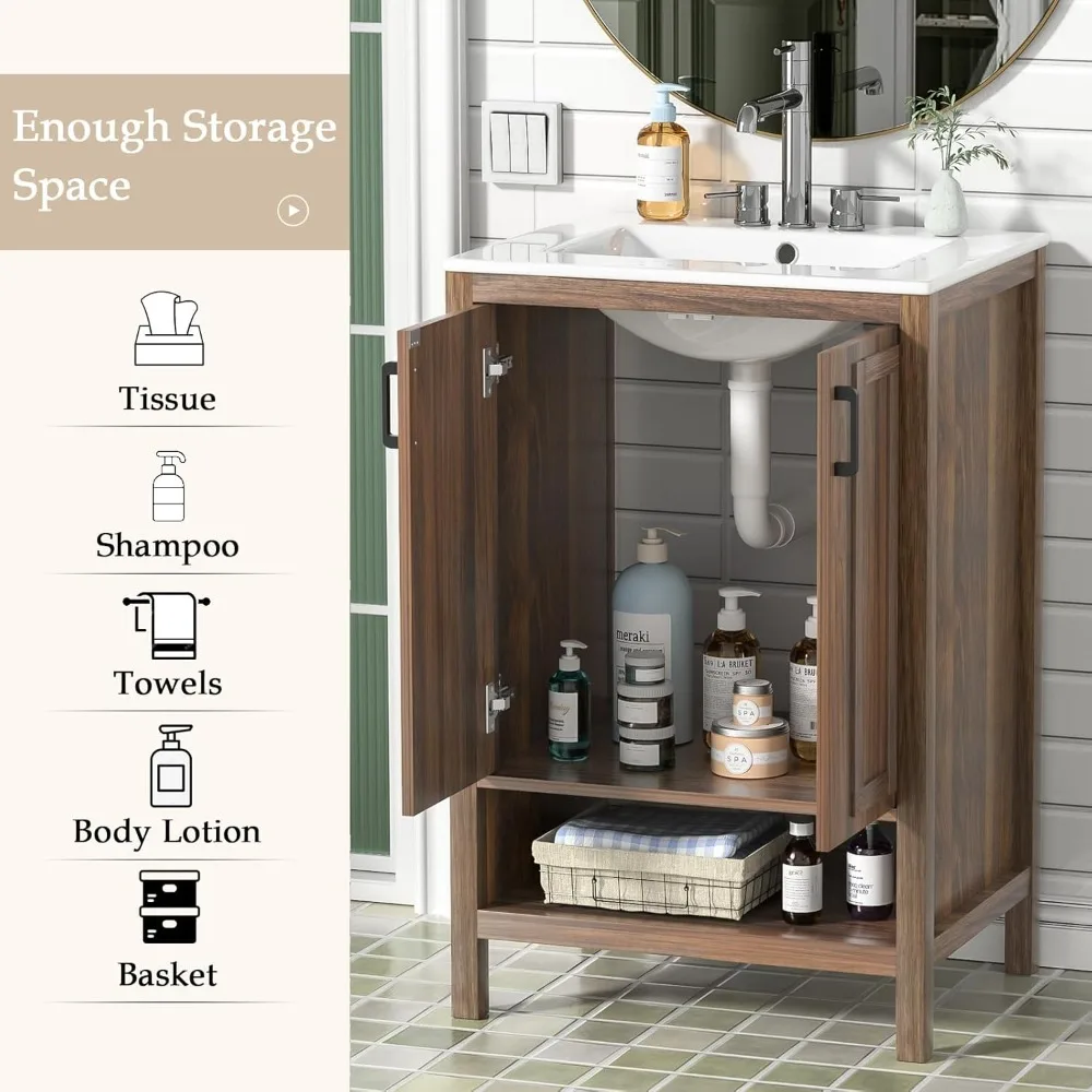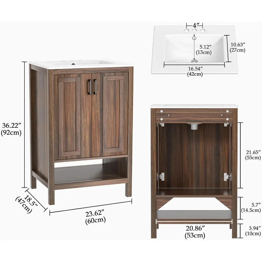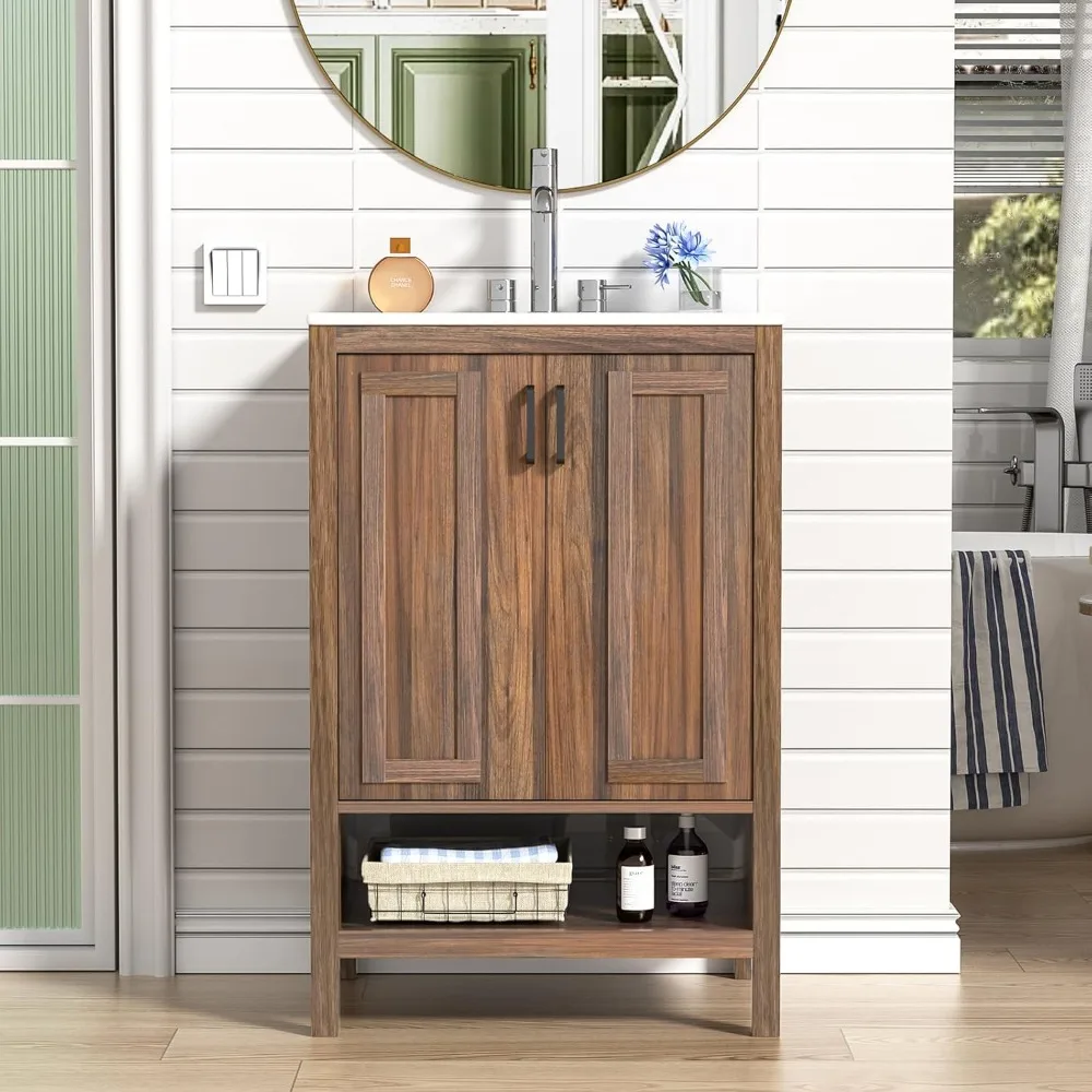 24" Modern Walnut Bathroom Vanity with Ceramic Sink, 2 Doors, Open Shelf, Space-Saving for Small Bathrooms (Faucet Not Included)