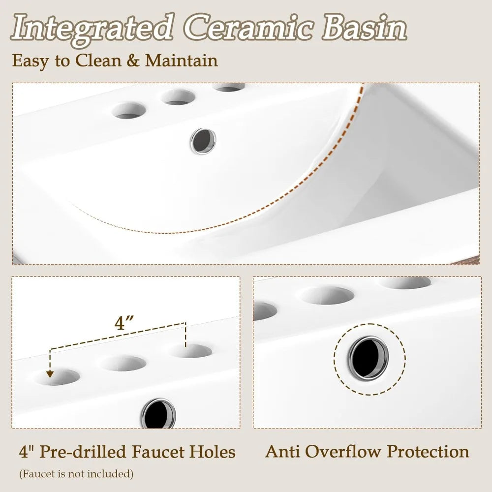 - Durable Ceramic Sink: The vanity includes a high-quality ceramic sink that is scratch-resistant, easy to clean, and built to with stand daily use. Its smooth surface and timeless design add a touch of elegance to your bathroom space.