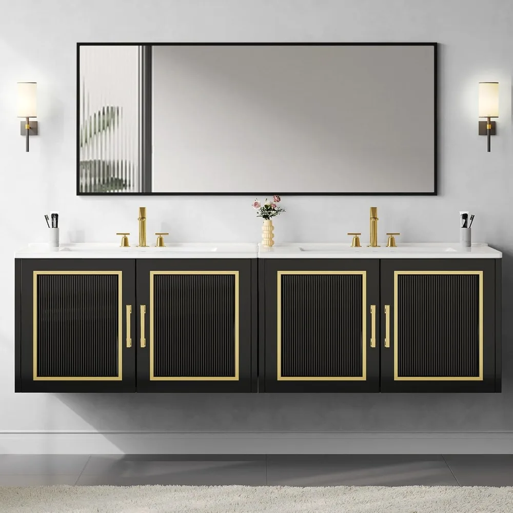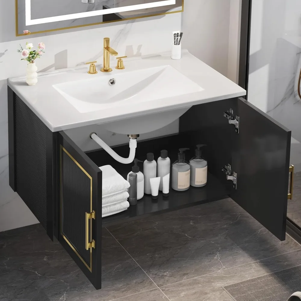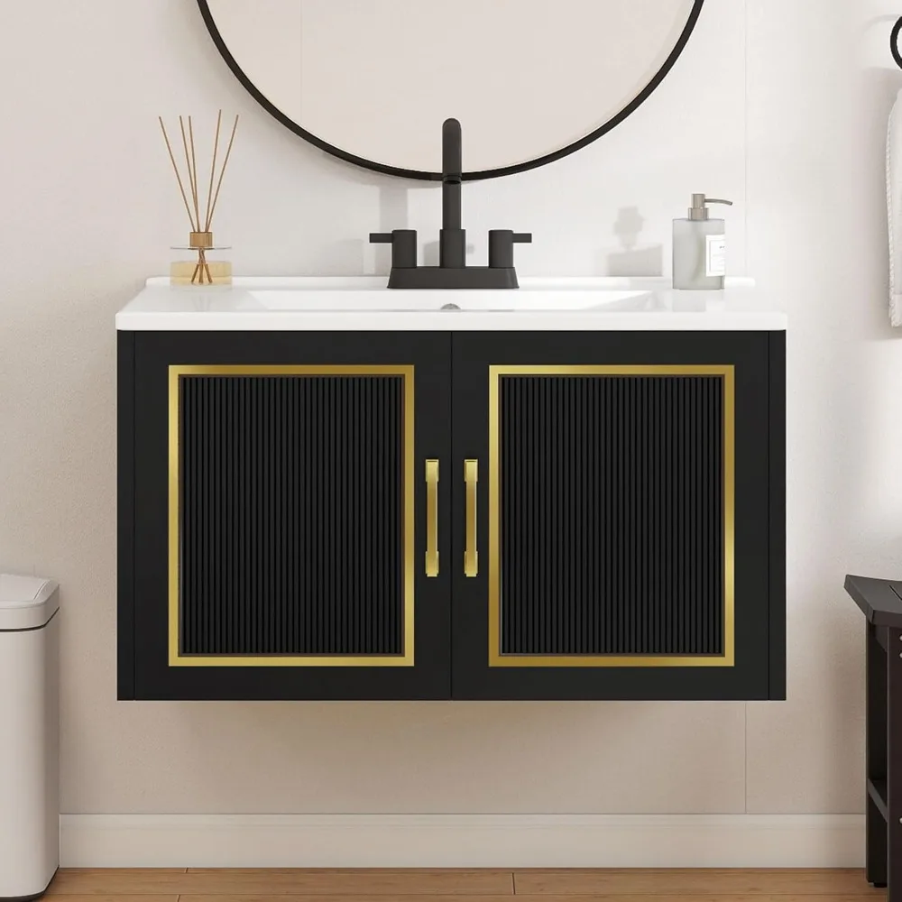 - Ample Storage Space: Features two spacious cabinets with soft-closing doors, providing plenty of storage space for all your toiletries and daily necessities. The well-designed gold metal handles make it easy to access and organize your bathroom essentials. Whether you have a small or large bathroom, this bathroom vanity cabinet is designed to accommodate your storage needs effectively.