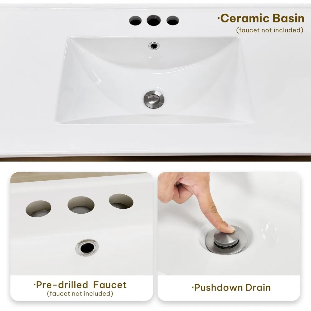 - High-hardness Ceramic Sink Combo: The bathroom vanity with sink boasts a countertop made of a durable sink set (faucet not included), embedded with a deep 4.7-inch press-type drain white ceramic sink. The sink features a smooth self-cleaning glaze surface and a curved design, ensuring effortless cleaning and preventing water splashes from occurring.