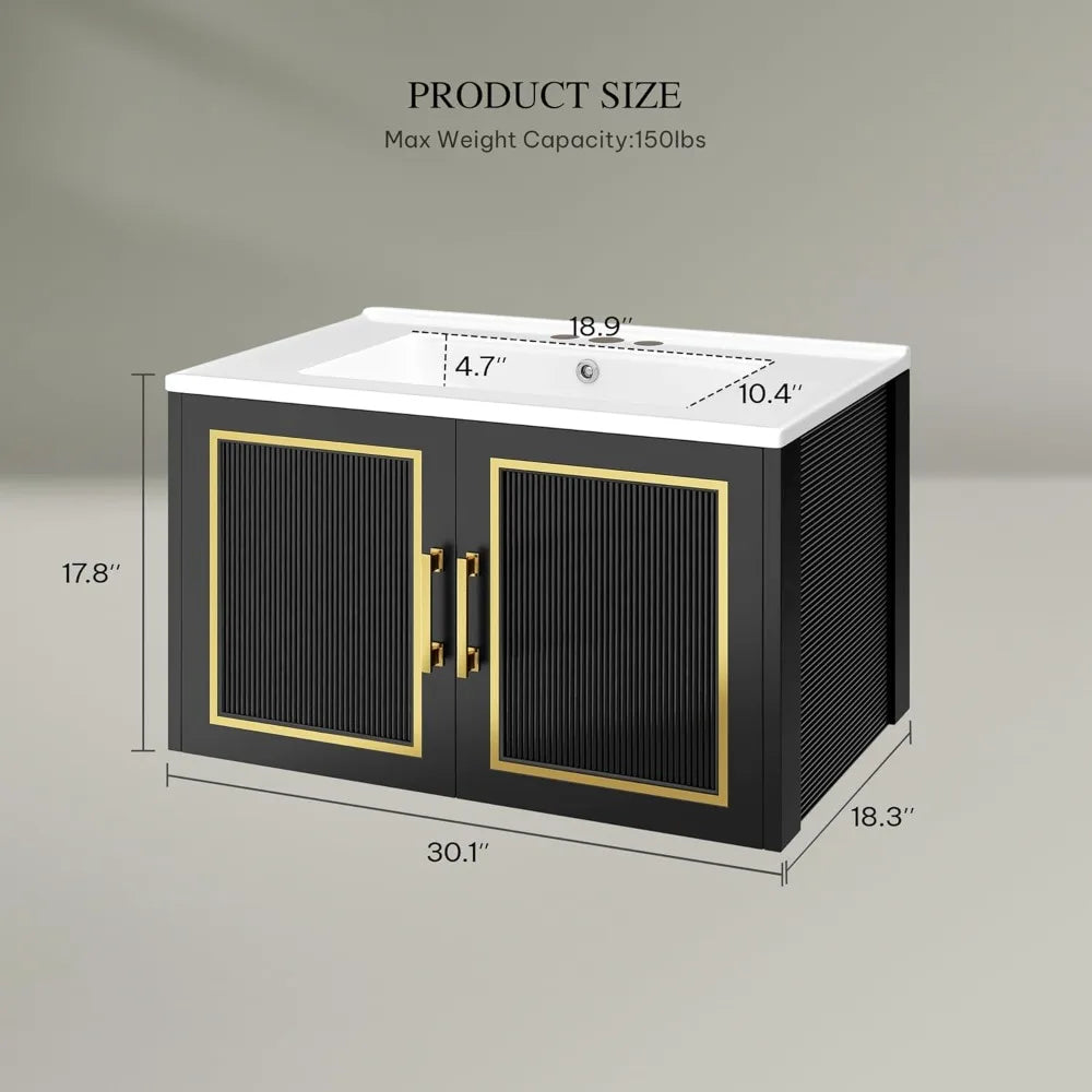 - Size Weight Capacity: The Black and gold bathroom cabinet measures 18.3"D x 30.1"W x 17.8"H, and the ceramic sink basin measures 10.4 x 18.9 x 4.7 inches. It has a weight capacity of up to 150 pounds. This bathroom vanity with sink is suitable for bathrooms ranging from 25-40 square feet and can also be installed in garages or RVs.
