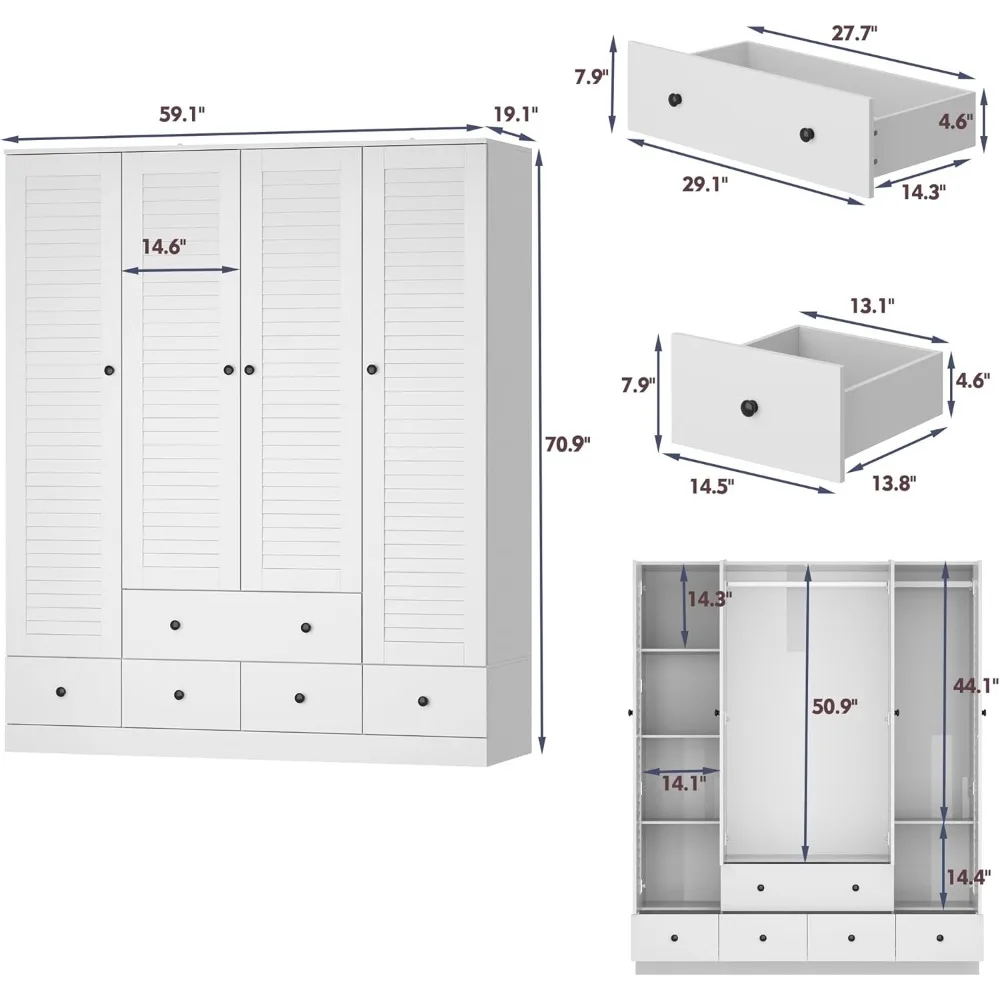 4 Shutter Door Wardrobe with Shelves and Drawers, Armoire Wardrobe Closet with 2 Hanging Rods, for Bedroom White