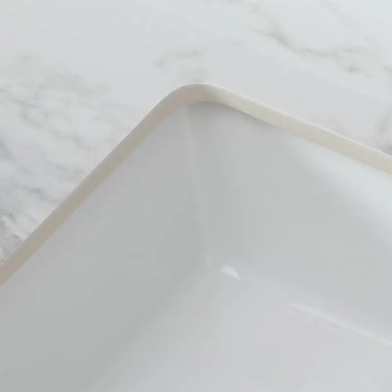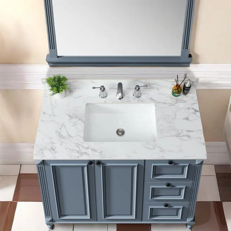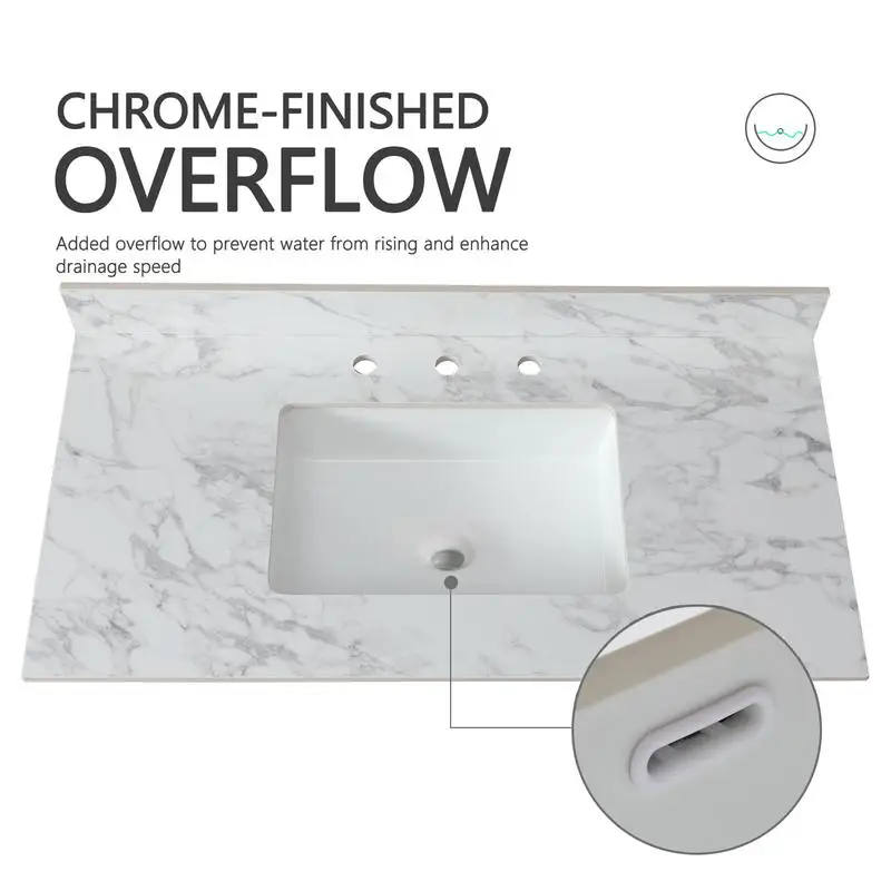 Easy To Installation: Undermount bathroom vanity sink top pre-drilled for 8-inch widespread faucet. Assembled stylish rectangular white ceramic middle sink with safety overflow hole. Vanity top with sink is easy to handle and perfect obtain the beauty and durability of engineered stone whether you're installing it yourself or hiring a professional.