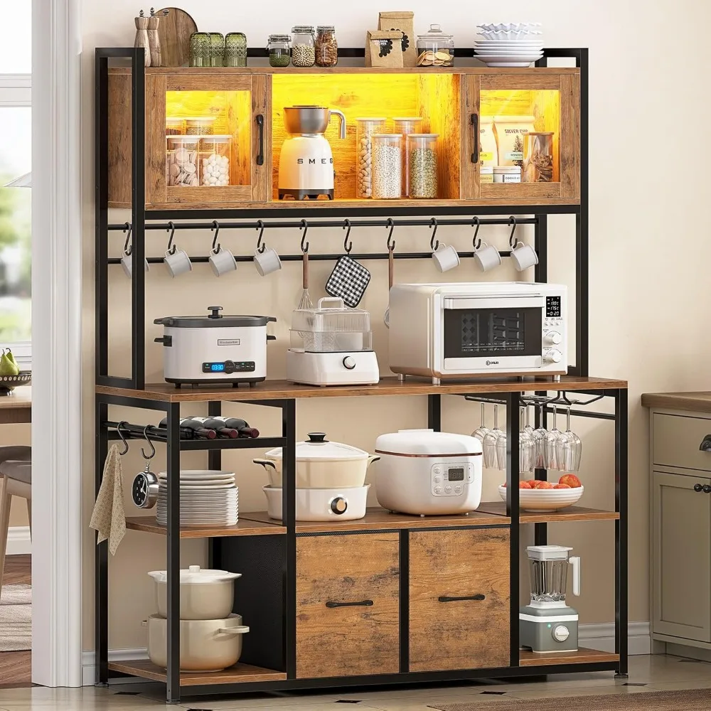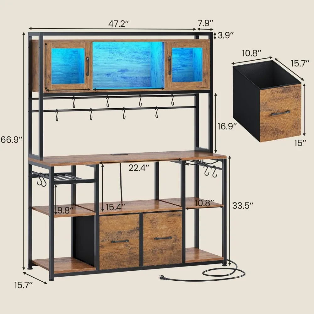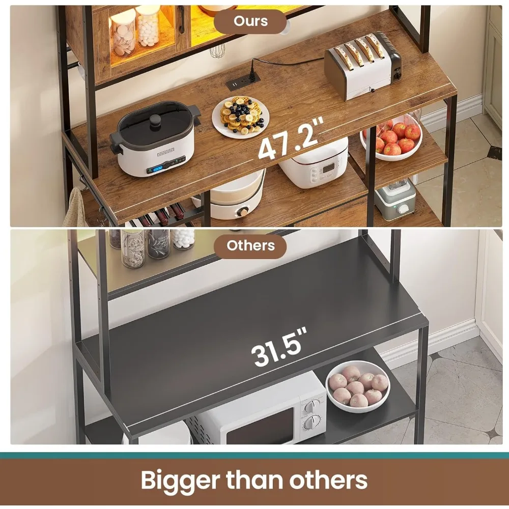 - 【Large Storage Space】The 47.2-inch bakers rack table top can provides enough space to placemicrowave, blender, coffee maker, spices, etc. Our baker rack features a top transparent acrylic cabinet and 2 bottom fabric drawers, providing separate, secure storage while effectively keeping dust out.