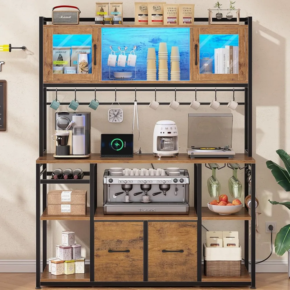 47.2 Inch Coffee Bar Cabinet with Power Outlet, Farmhouse Bakers Rack with Storage, Kitchen Microwave Stand with Wine Rack, LED
