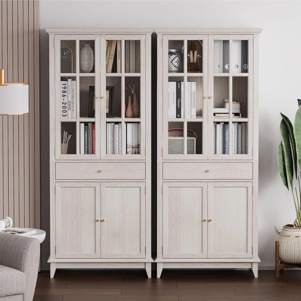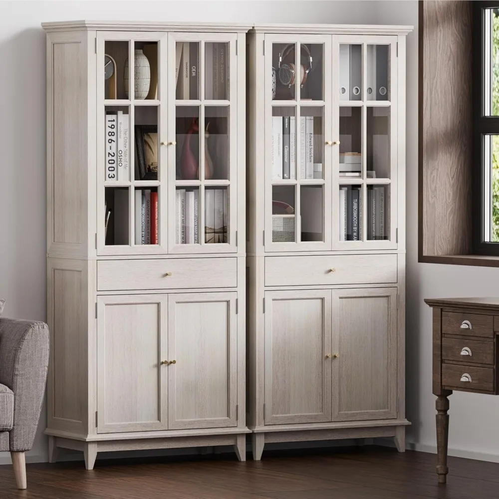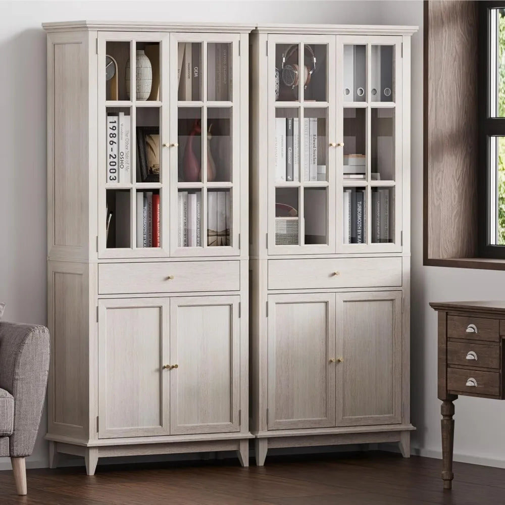 72.8" White Oak Bookcase with Glass Doors & Drawer - Adjustable Shelf, Modern Classic Storage for Living Room, Home Office