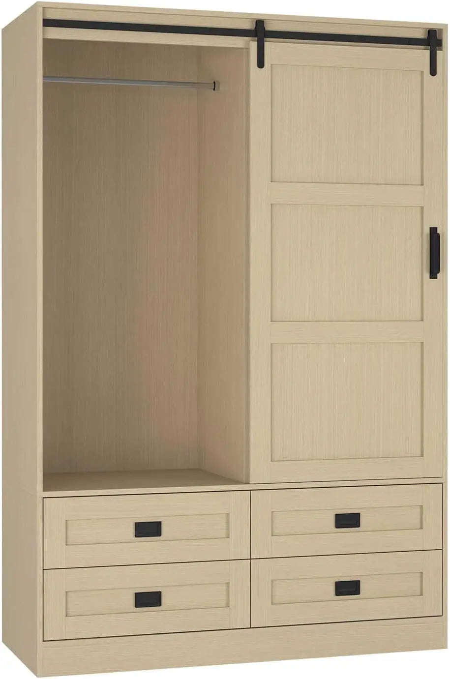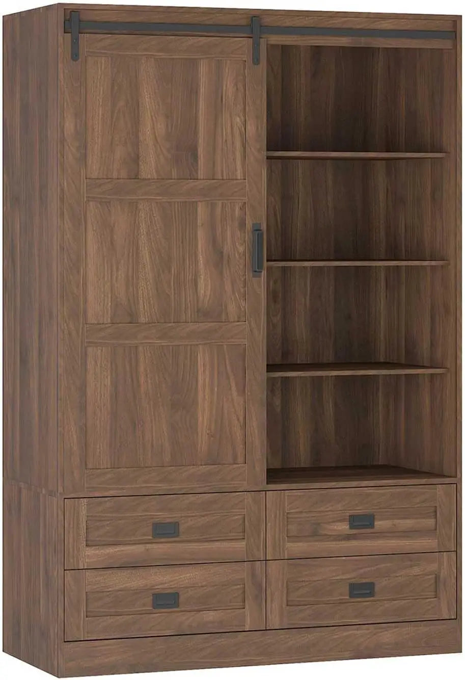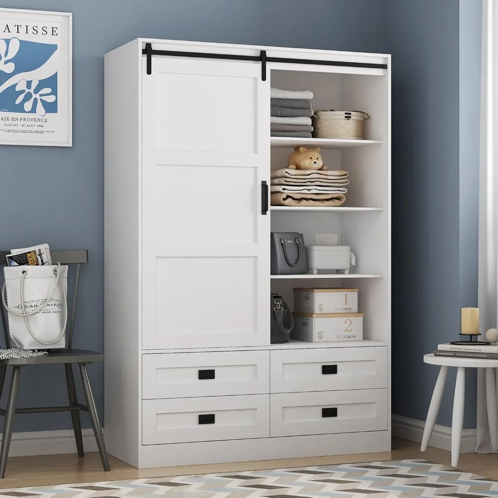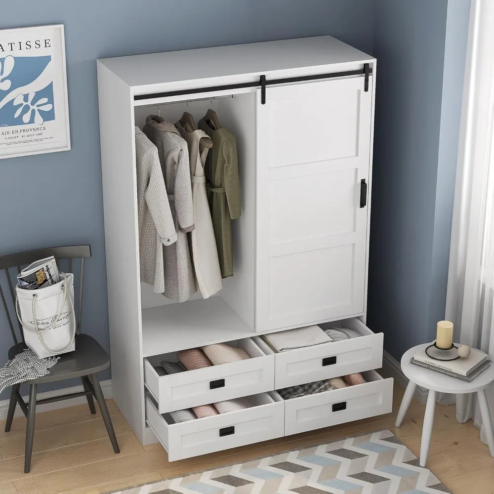 Armoire Wardrobe Closet with Sliding barn Door,Wardrobe Cabinet with 4 Storage Drawers and Hanging Rail,Freestanding Wooden