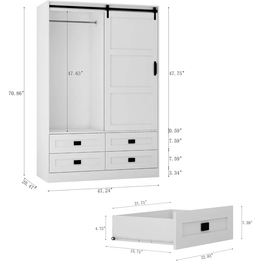 - 【Innovative Farmhouse Design】The wardrobe closet combines farmhouse charm with practical storage, measuring 47.24''W x 20.47''D x 70.86''H, featuring 4 drawers, 4 open storage spaces, and a sliding barn door .