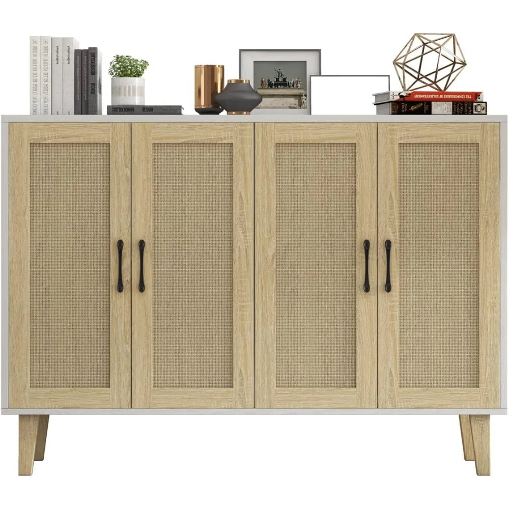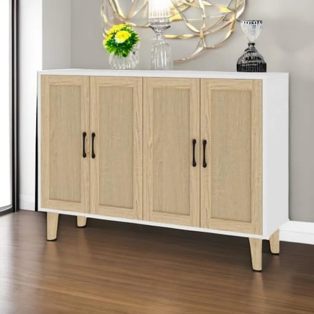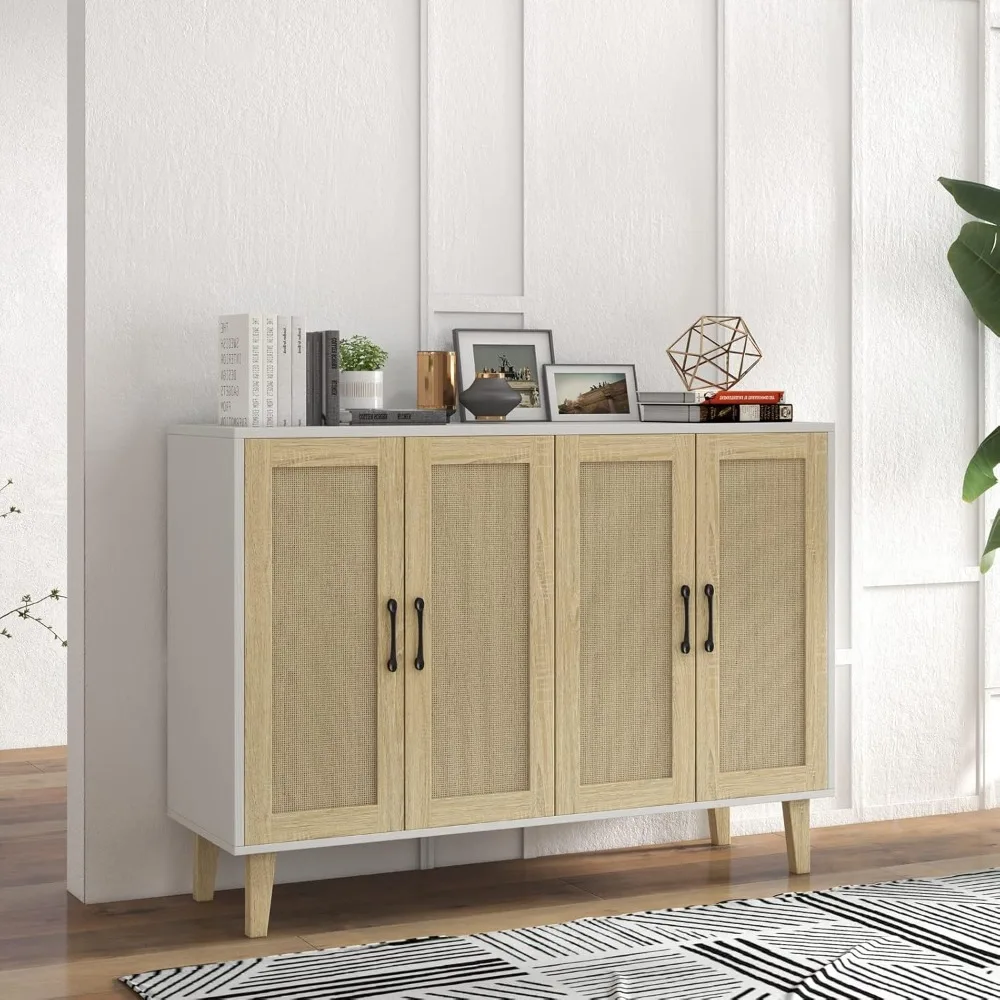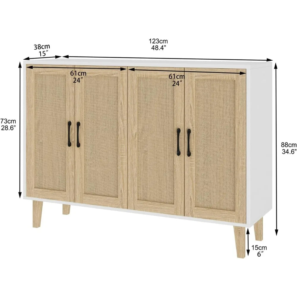Buffet Storage Cabinet with Rattan Decorating 4 Doors Living Room Kitchen Sideboard 48.43 x 34.65 x 15 inch (White)