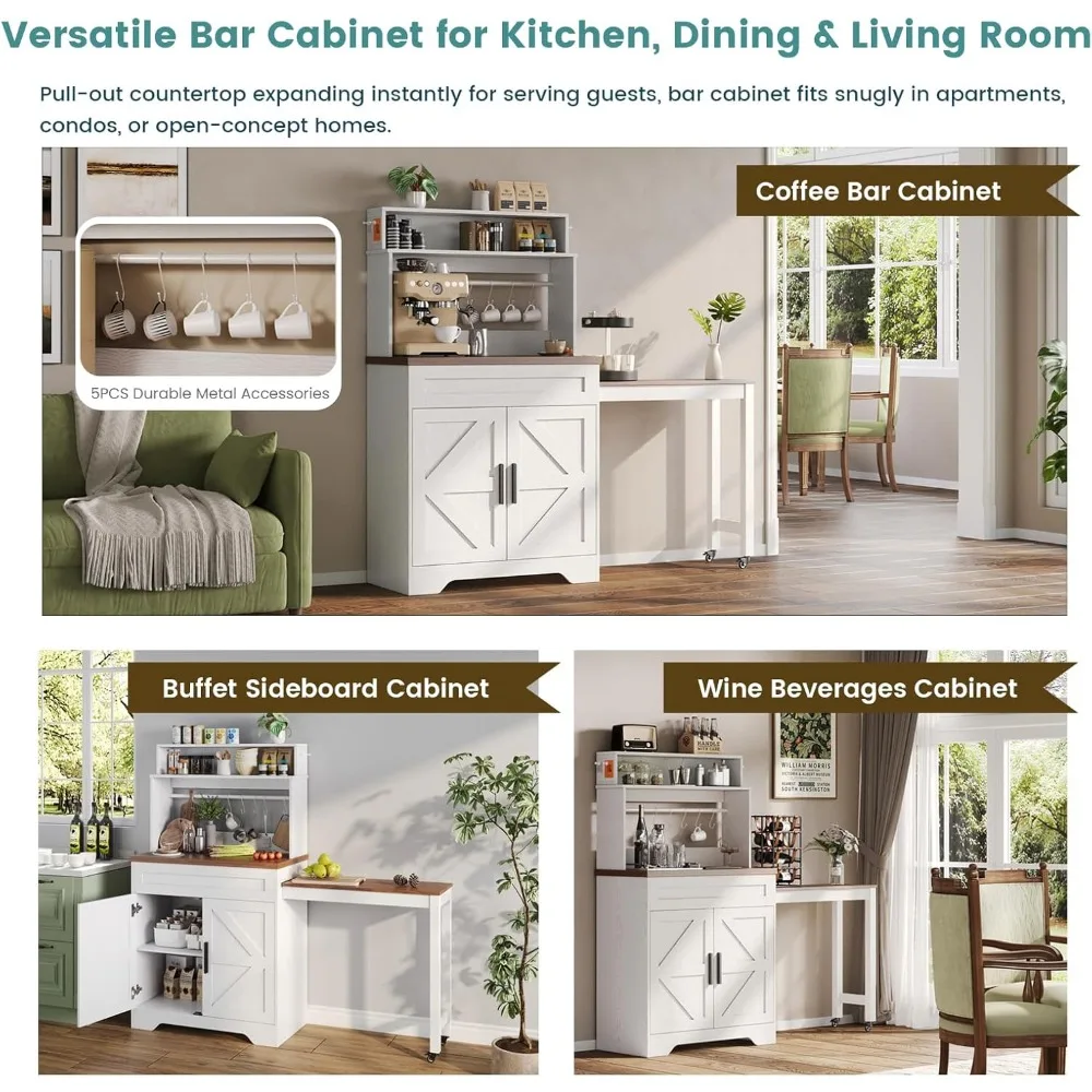 - Extendable Bar Table with Wheels: The coffee bars features the extendable table( added extra length of 25.6 inches) with silent wheels for your convenience. The pull-out countertop expands instantly for serving guests, and the bar cabinet fits snugly in apartments, condos, or open-concept homes