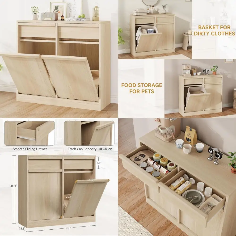 Here's a rewritten product description based on the provided text, ensuring it's in English and free from special characters: --- Discover our Hidden Trash Cabinet, a sleek and practical solution designed to conceal your garbage and waste bins while maintaining a clean and organized appearance in your kitchen or living space. This cabinet not only keeps your trash out of sight but also prevents pets from accessing the bins, reducing the risk of spills and messes. Our Easy Trash Disposal Design features a tilt-out mechanism that simplifies waste disposal. With a simple tilt of the front panel, you can effortlessly access and dispose of trash without the hassle of lifting heavy bags or bins. The cabinet also includes two pull-out drawers and a spacious tabletop, offering additional storage for recycling bins or cleaning supplies. Constructed with sturdiness in mind, our trash can cabinet is reinforced at the bottom and sides to support the weight of fully loaded garbage bins (up to 50 pounds). It fits seamlessly into your kitchen or utility room, providing a dedicated space for trash without taking up valuable floor or countertop space. To enhance stability and prevent tip-over accidents, we recommend using the included anti-toppling device. Beyond trash storage, this cabinet is versatile, suitable for various uses such as pet food storage, a laundry hamper, or even a kitchen island. It's easy to clean, ensuring your cabinet stays pristine and looking as good as new every time. Assembly is a breeze with our clear instructions, even for those with no prior assembly experience. Should you encounter any issues with your trash bin cabinet, whether before or after purchase, our professional customer service team is available 24/7 to assist you. --- This rewritten description maintains the original meaning while ensuring it's free from special characters and presented in a different structure.