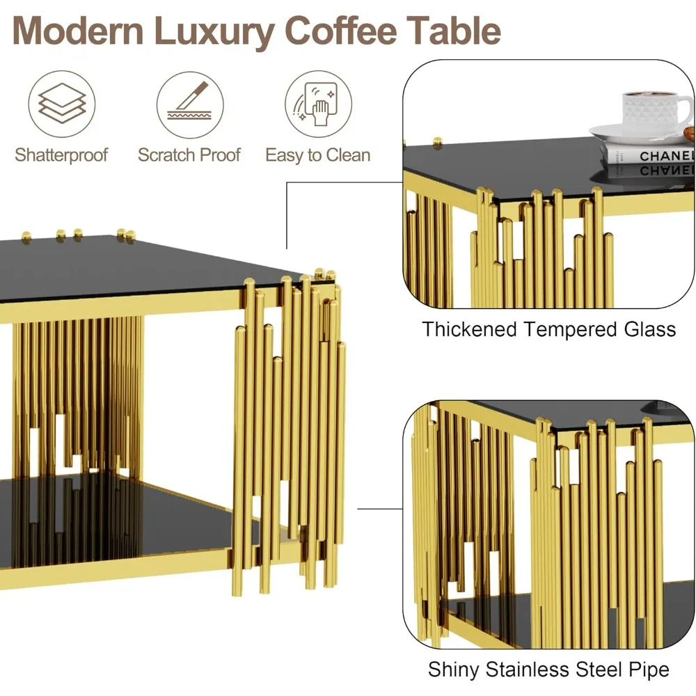 Gold Glass Coffee Table Black Modern Living Room Table Stainless Steel Metal Leg Large Rectangular Tempered Glass Center Tables