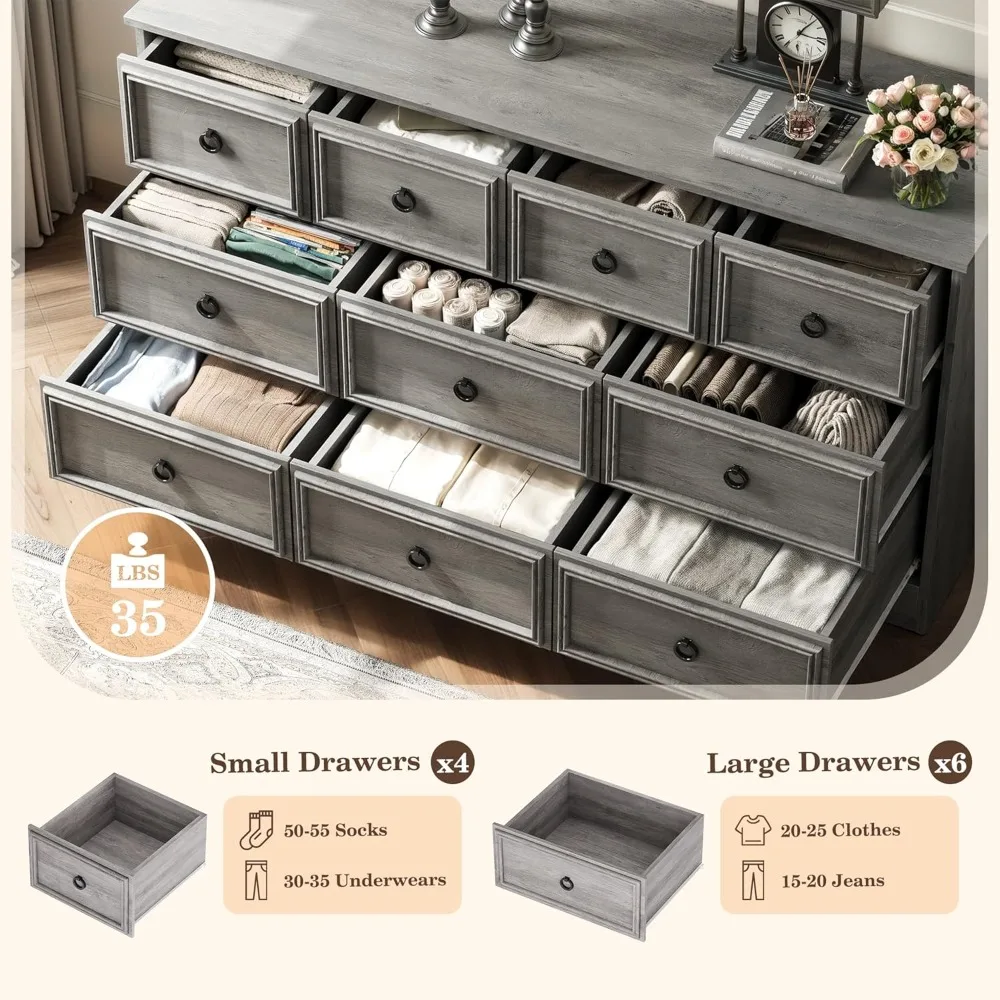 Size details: This dresser for bedroom measures 15.75"D x 59.05"W x 32.28"H. 4 top drawers size: 8.8"H x 13.98"W x 14.57"D, 6 bottom drawers size: 8.8"H x 18.7"W x 14.57"D. 2 different sizes of drawers can provide multiple storage options and ample storage space to store and sort clothes/toys/blankets and other household items, which makes your bedroom more organized.