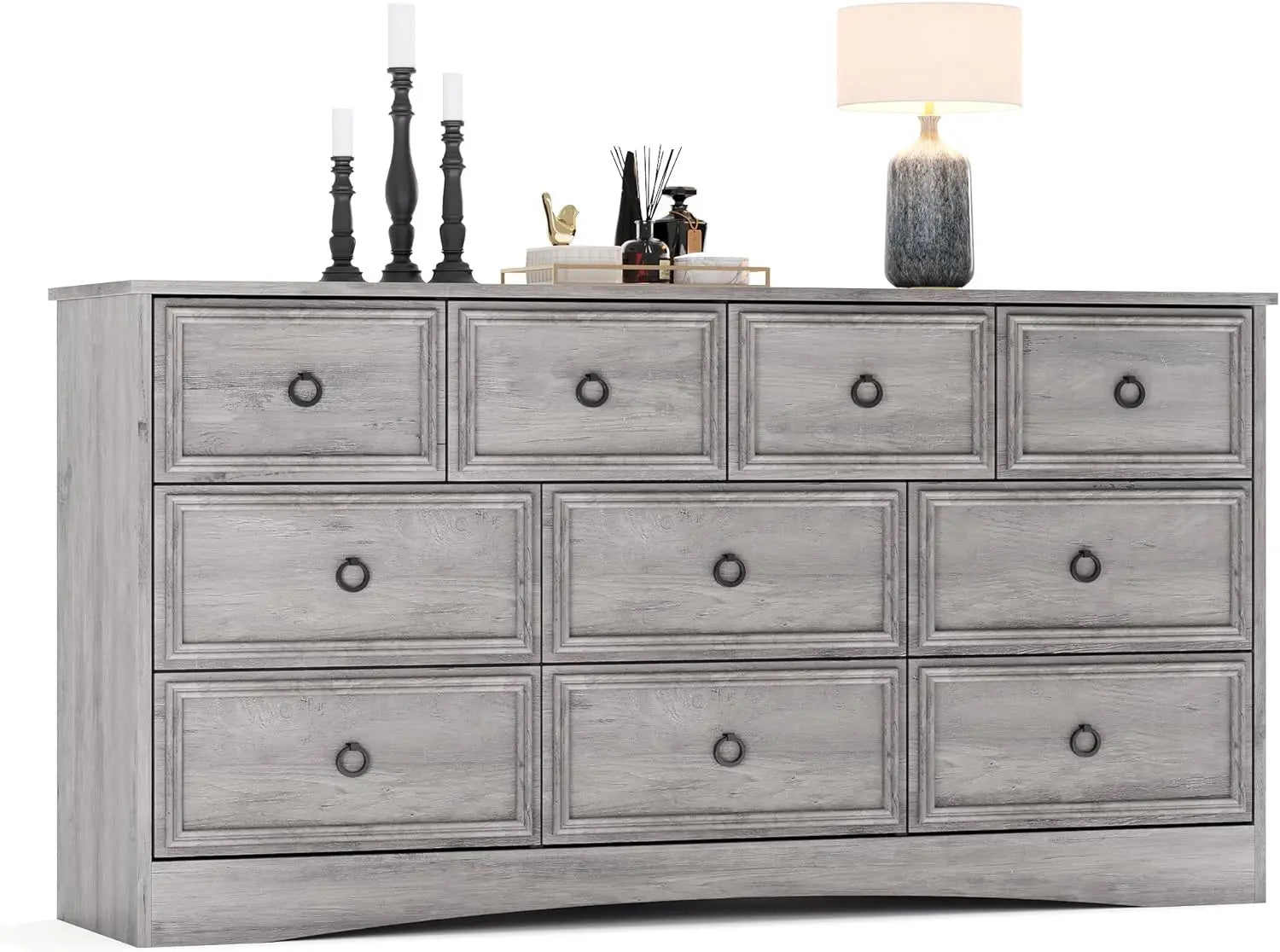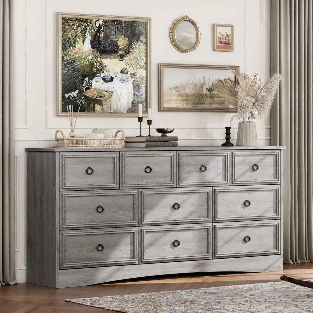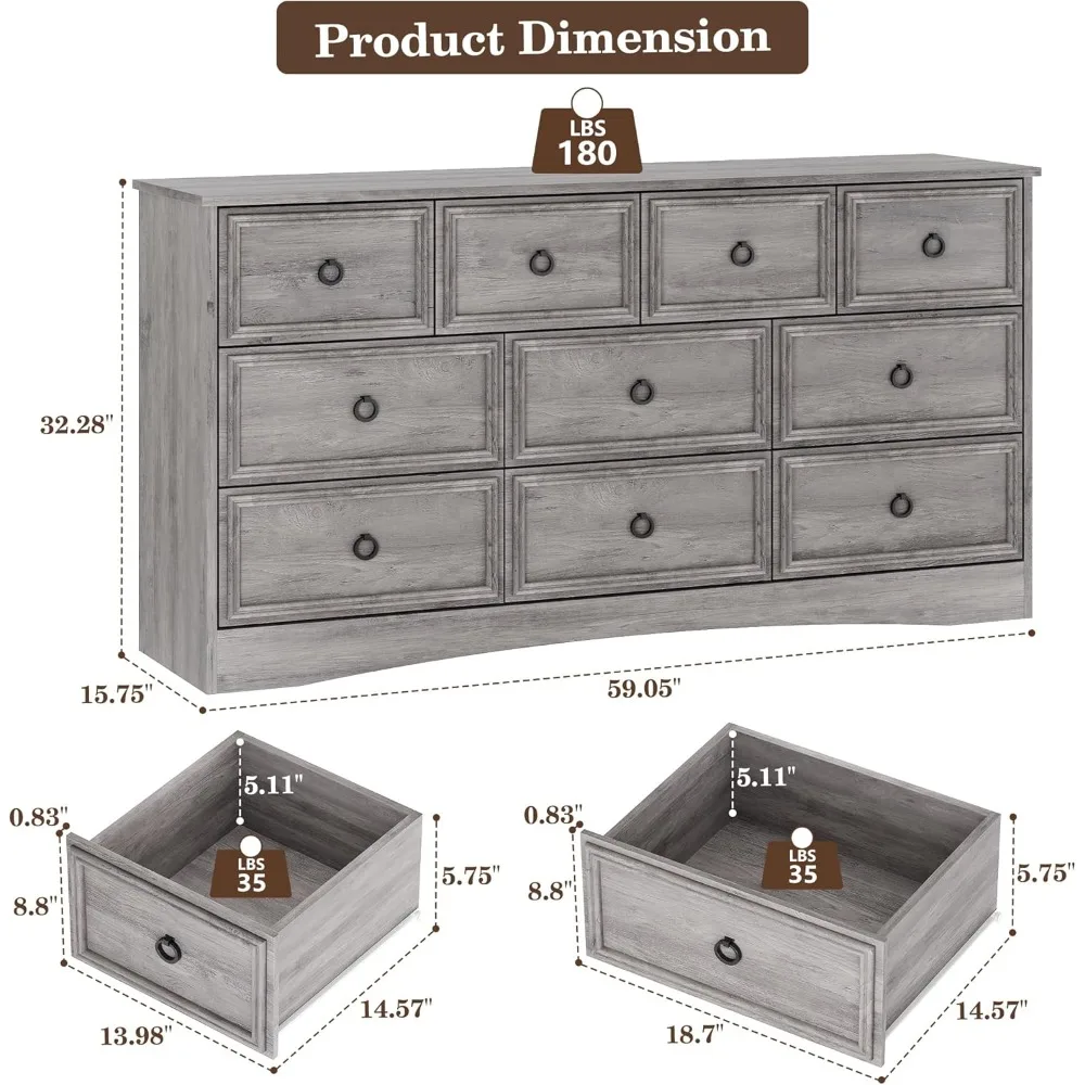 Versatile Dresser: This dresser has 10 deep and wide drawers. Whether you need a large dresser to store clothes in the bedroom or a TV stand to place in the living room or bedroom, the top width of the chest of drawers is 59 inches, which can hold a 65/70-inch TV on it, this dresser can meet all your needs. It can be placed in the living room, bedroom, hallway, entrance, cloakroom, dressing room.