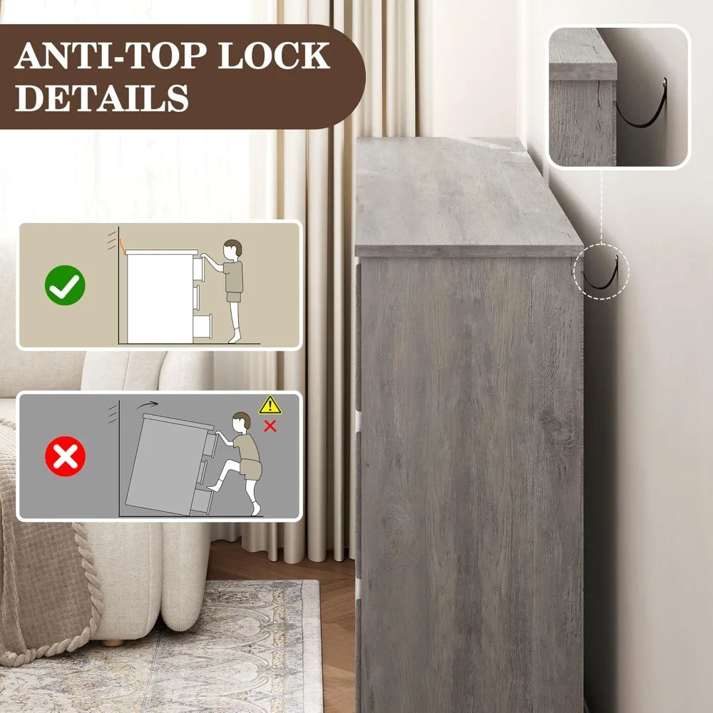 Sturdy and safe structure: Equipped with anti-tip device, and the ground-closed base is more stable and will not tip over, protecting your family from potential dangers. The grey dresser is made of melamine board, which is solid and prevents the surface of the dresser from being scratched. Each drawer is equipped with metal 2-section bottom slides on both sides, allowing the drawers to be pushed and pulled quietly and smoothly without worrying about getting stuck.