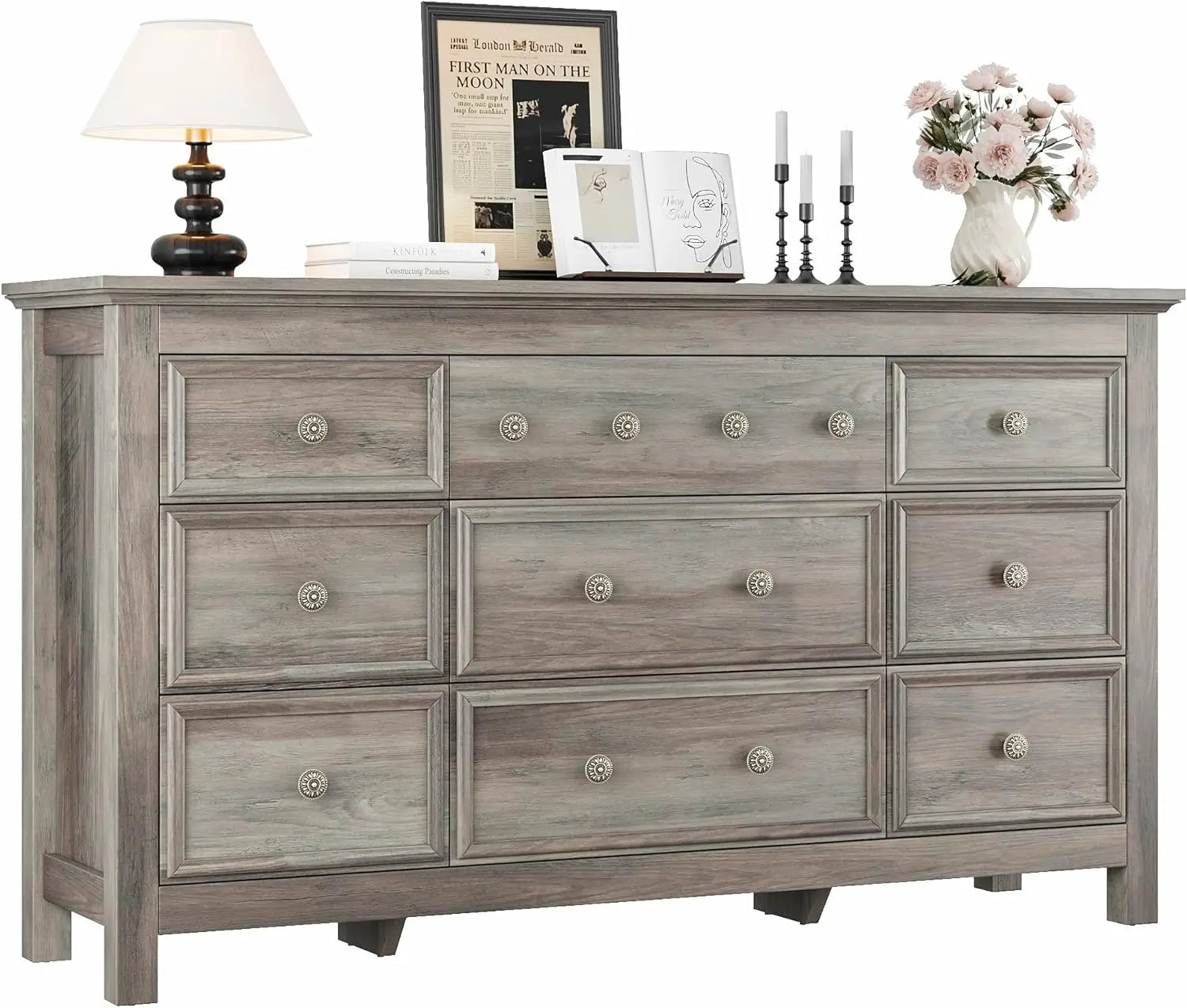 Grey Dresser, Large Dresser for Bedroom, Wood Chests of Drawers Metal Ring Pull, Textured Borders, TV Stand