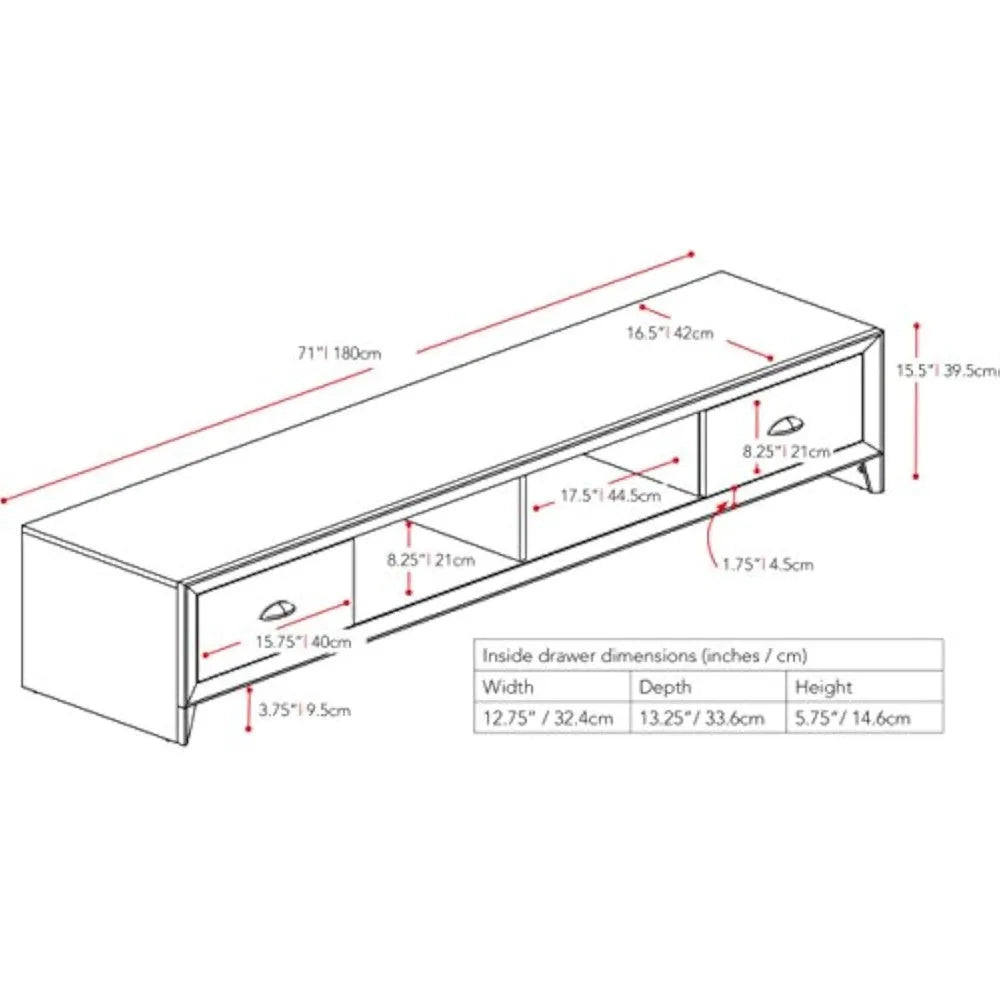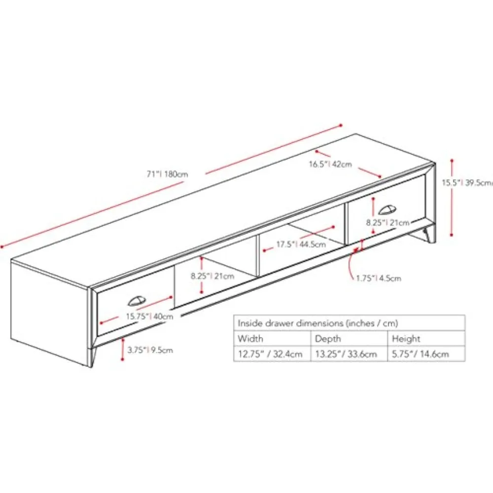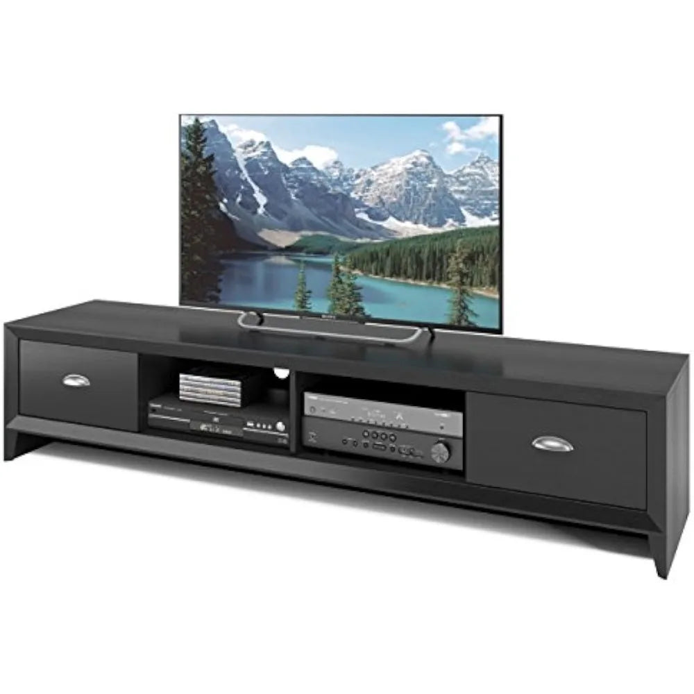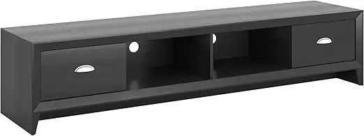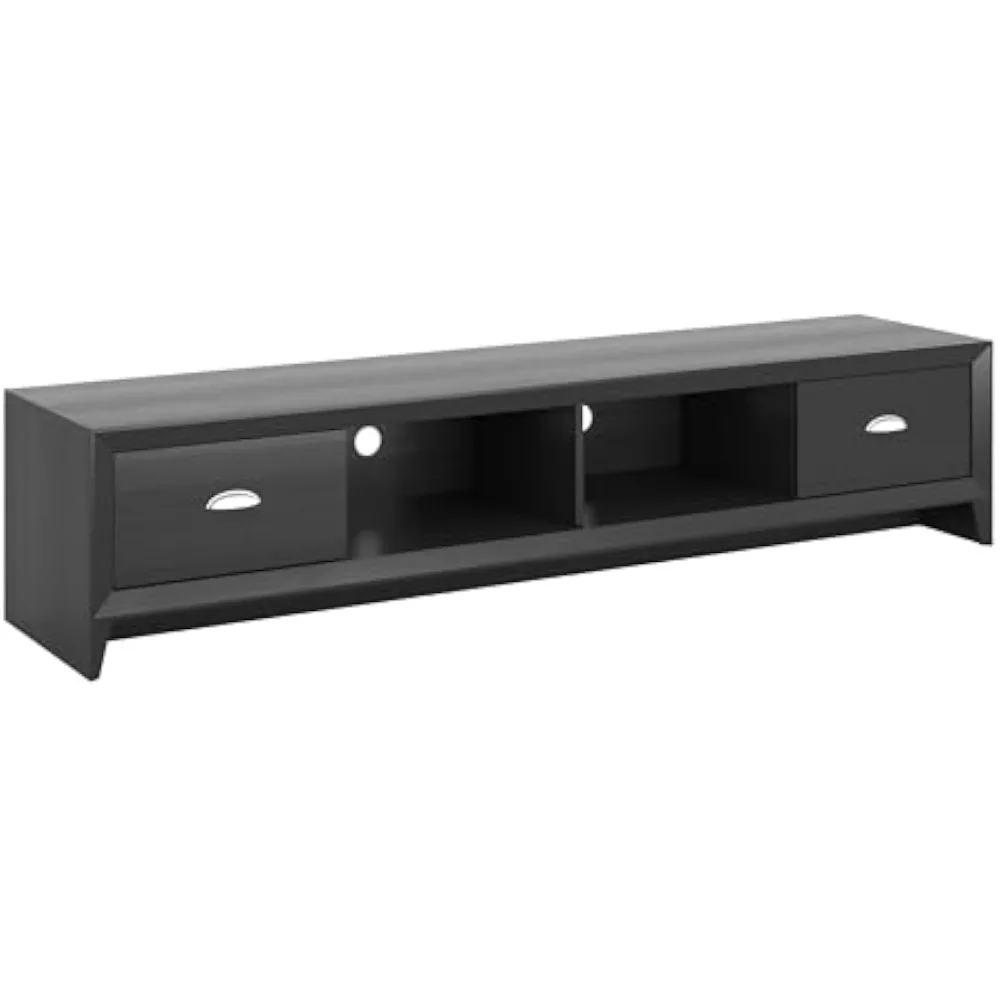 This TV stand is designed to accommodate large televisions up to 85 inches, offering a generous space for your entertainment center. It features two spacious drawers with stylish imitation nickel handles, providing ample hidden storage for your accessories. In addition to the drawers, there is open shelving available for storing audio/video equipment, remote controls, and decorative items. The stand includes a built-in cable management system to keep cords tidy and out of view. Its low profile and elongated design contribute to a sleek, modern aesthetic. The product comes with a 1-year limited manufacturer's warranty, covering any manufacturer defects or damage, as well as assistance with missing parts.