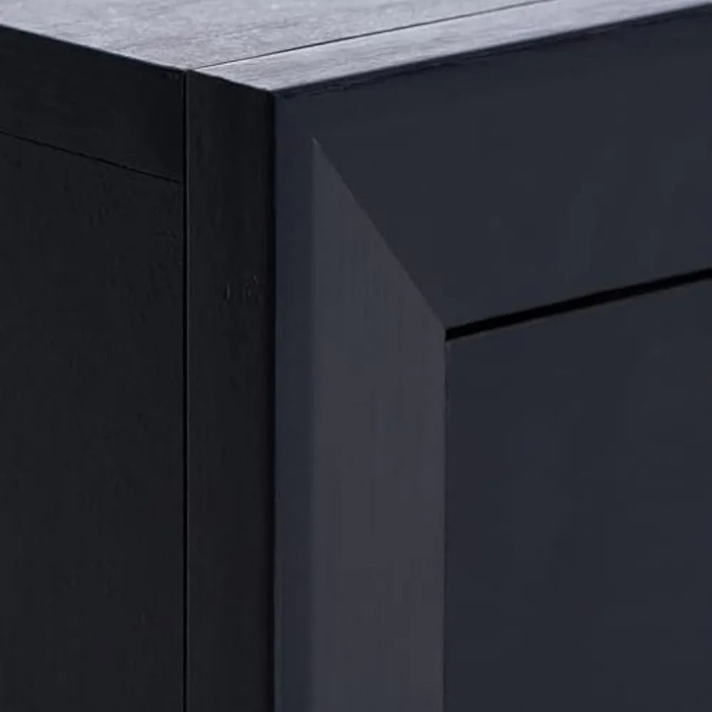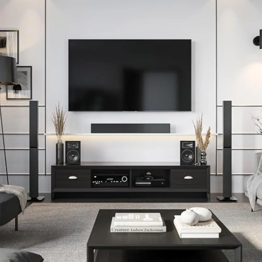 large modern black engineered wood tv stand with drawers for tvs up to 85", suitable for living room and bedroom