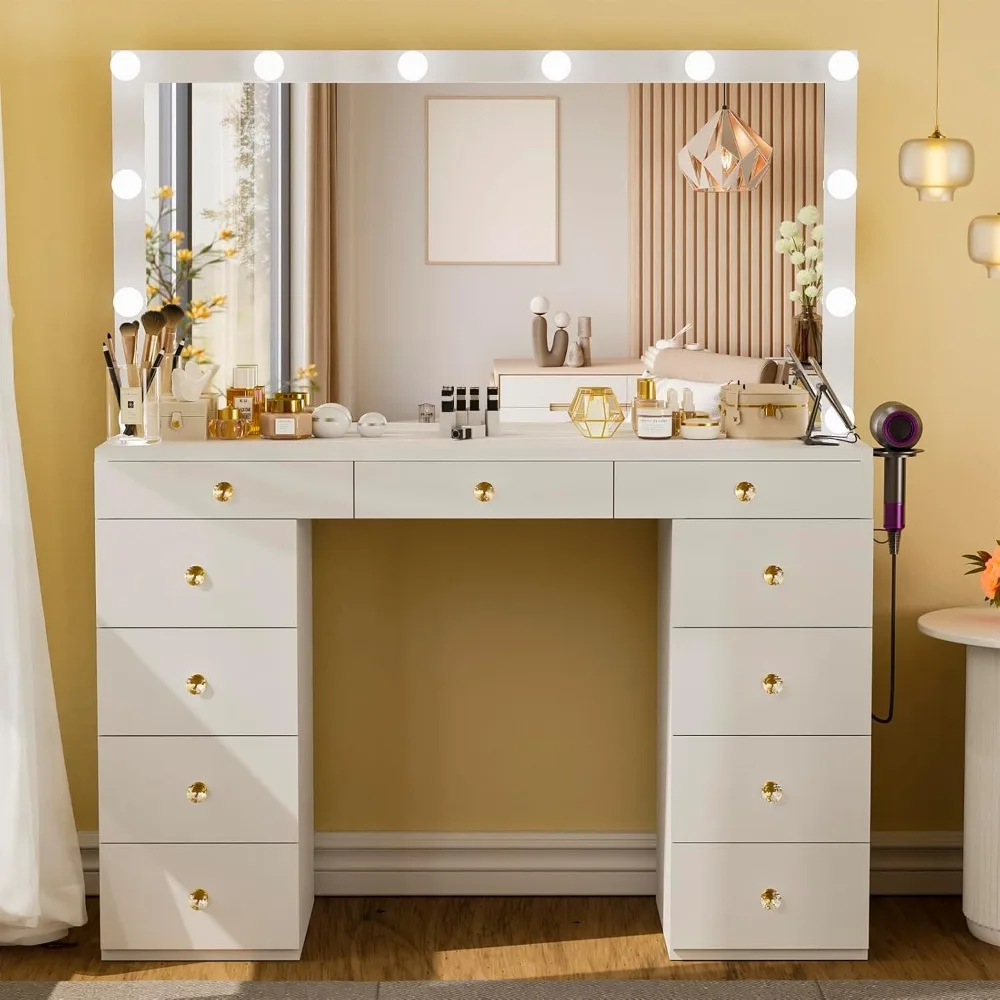 - 【Vanity with 11 Large Drawers 】Try Likein makeup table with great storage function, 11 large sliding drawers will solve your storage worries! Allowing you to neatly store and organize your collection of makeup, fragrances, hair tools, and other essential beauty items. Say goodbye to cluttered countertops