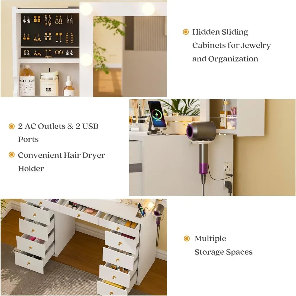 Likein Vanity Desk with Mirror and Lights, White Vanity with Hidden Jewelry Storage Cabinet, Charging Station, 11 Drawers Makeup