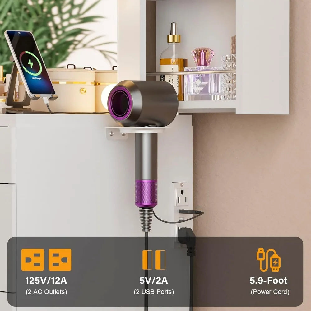 - 【Makeup Vanity with Charging Station】This vanity table comes with a charging station and hair dryer holder, including 2 standard plug sockets and 2 USB ports to connect your hair dryer, curling iron, computer, cell phone, ipad and other devices, so that all activities can be carried out on this makeup table