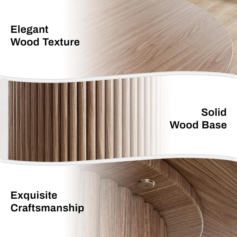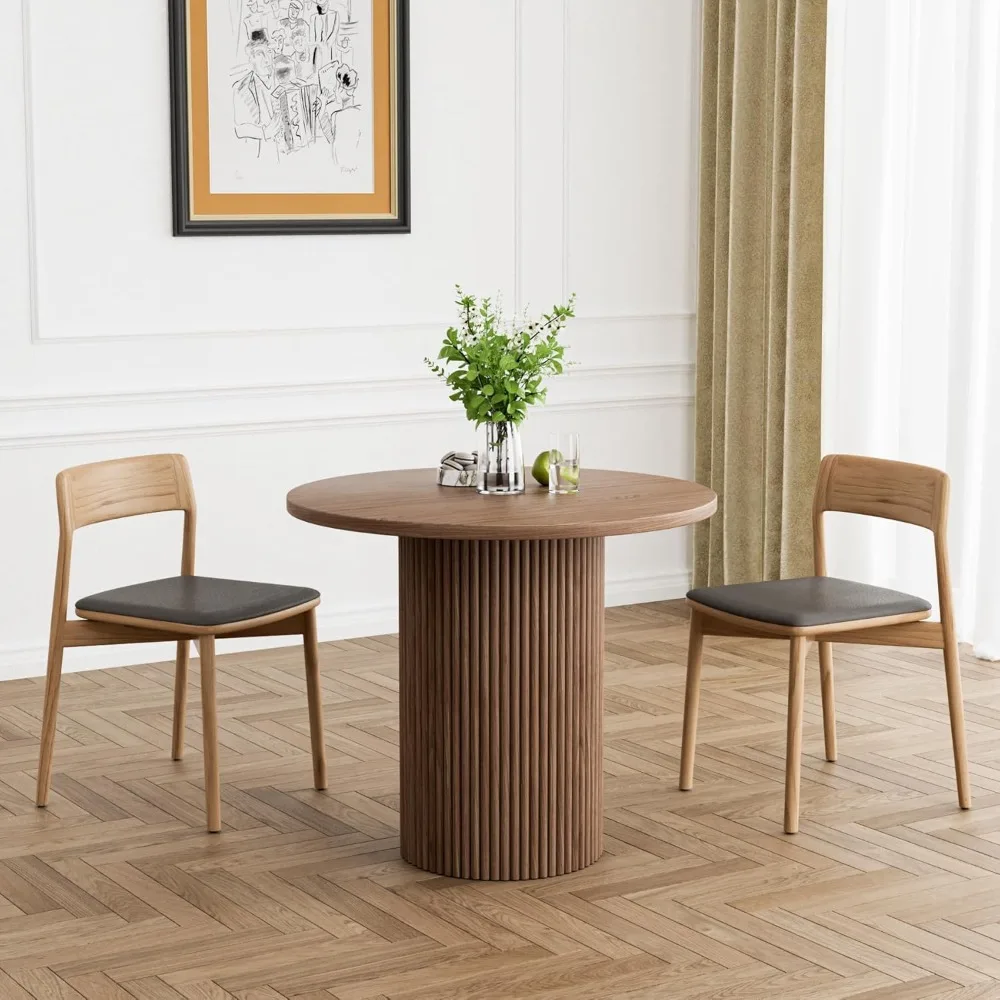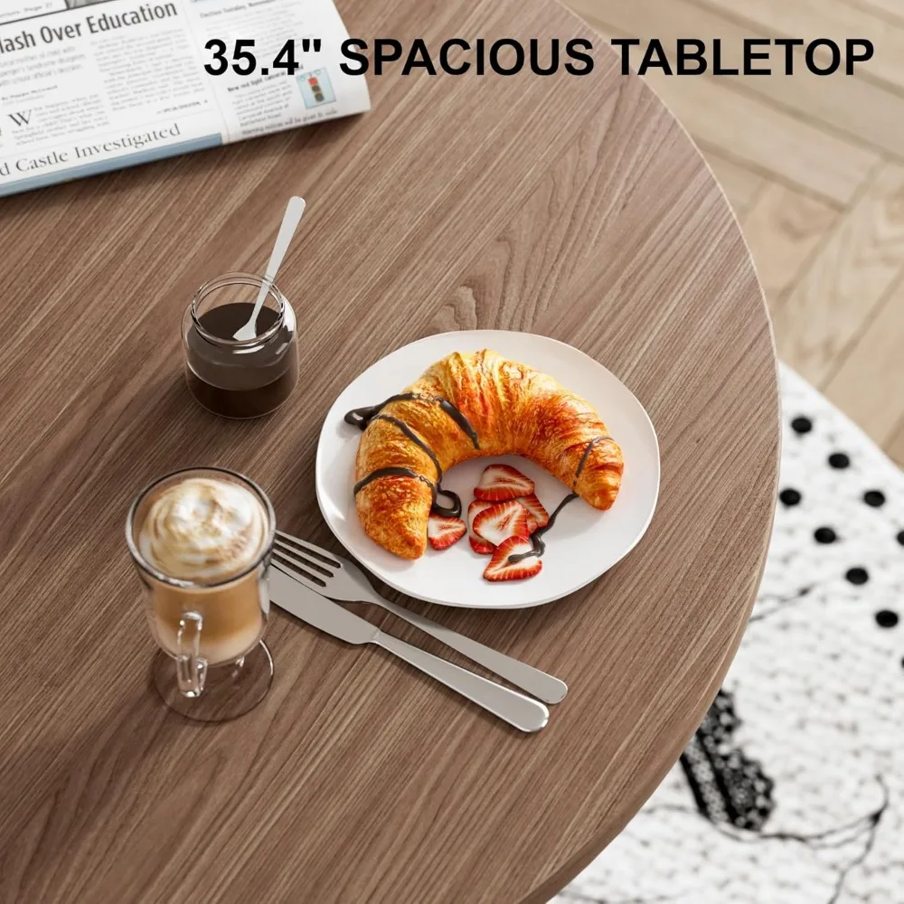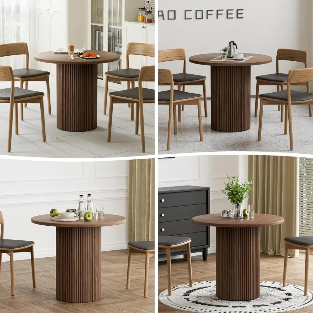 This contemporary round dining table boasts a natural texture and a comfortable feel, with a columnar base that has been meticulously polished to present clean geometric lines. The table's overall T-shaped design is elegant and minimalist, seamlessly blending with various decorative styles. Made with premium materials, the tabletop is crafted from high-quality MDF, while the base is constructed from solid wood strips, ensuring a thicker, heavier, and more robust structure that is both sturdy and long-lasting. The table features an aesthetically pleasing Roman column base design, which not only adds elegance but also contributes to its stability. The special fixing mechanism of the base makes this fluted dining table solid and stable, suitable for both indoor and outdoor use as a dining, coffee, or leisure table. Assembly is a breeze with a complete set of screws, tools, and instructions, allowing you to put the table together in just 5-10 minutes. The smooth surface of the table is varnished, making it waterproof and resistant to stains, and it can be effortlessly cleaned with a damp cloth. Measuring 35.4 inches in width and depth, and standing at 29.9 inches in height, this spacious table top is designed to comfortably seat 4 to 6 people for dining. Please note that the table is sold without chairs.