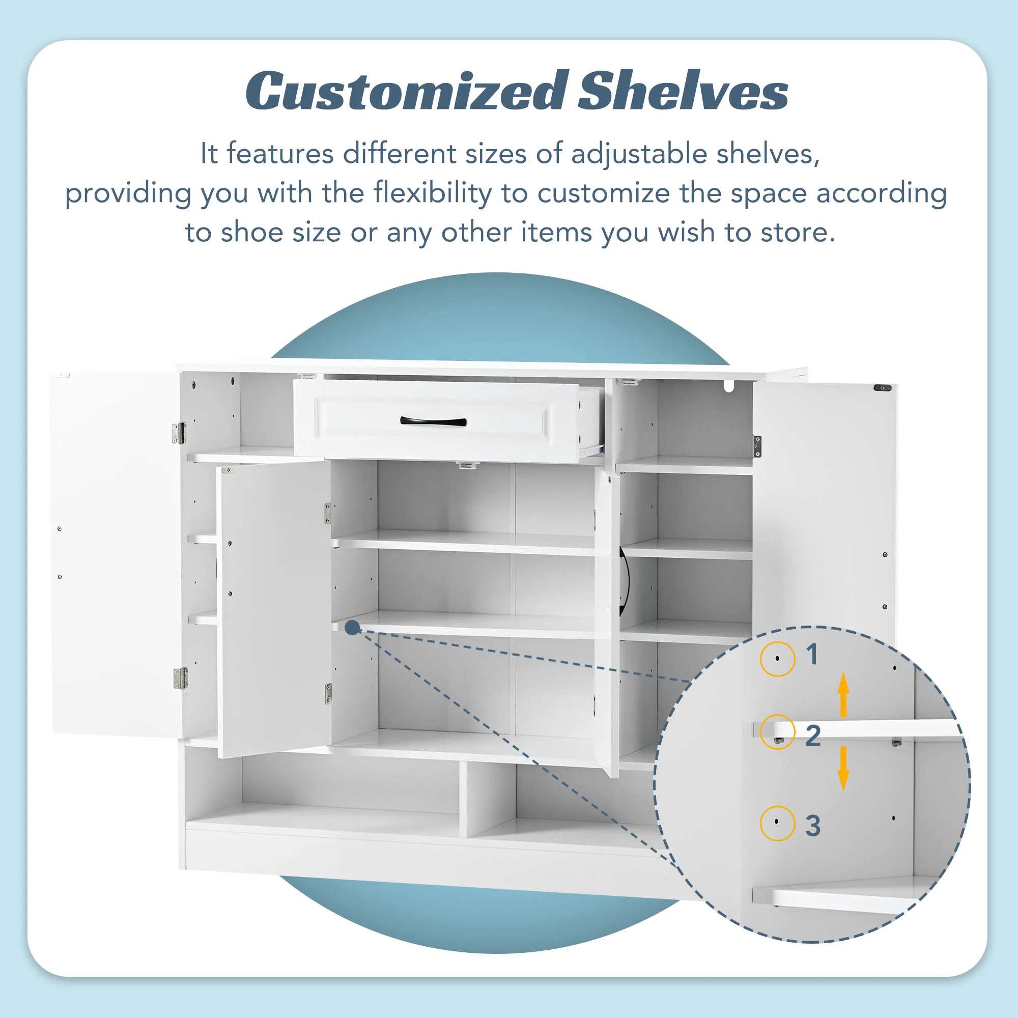 【Ample Storage Holds Up to 20 Shoes】 : Equipped with 3-4 spacious cabinets, practical open shelves, and a dedicated drawer for accessories like shoelaces and keys, this shoe cabinet with drawer provides sufficient capacity for various shoe sizes—keeping your entryway neat and clutter-free.