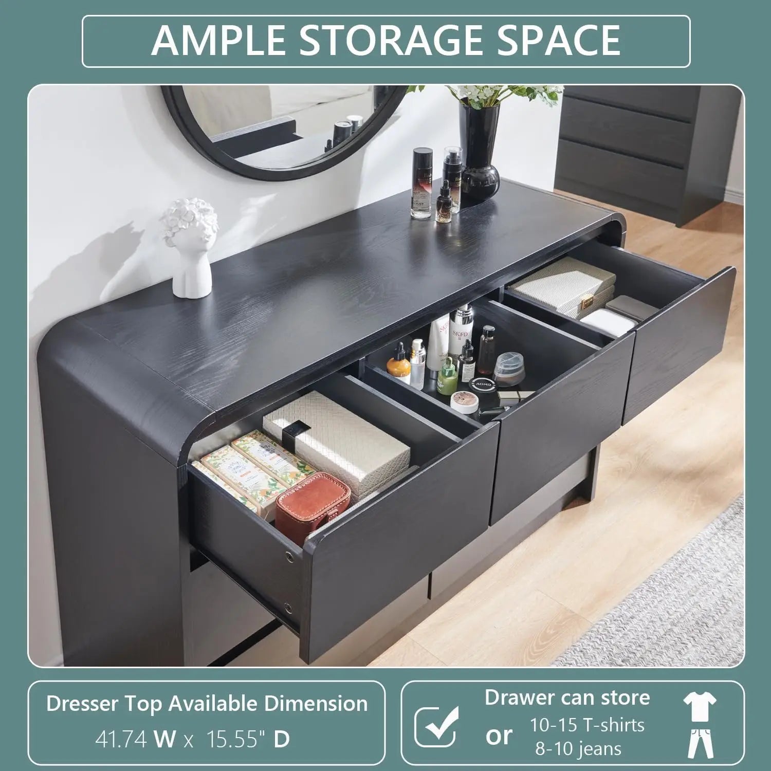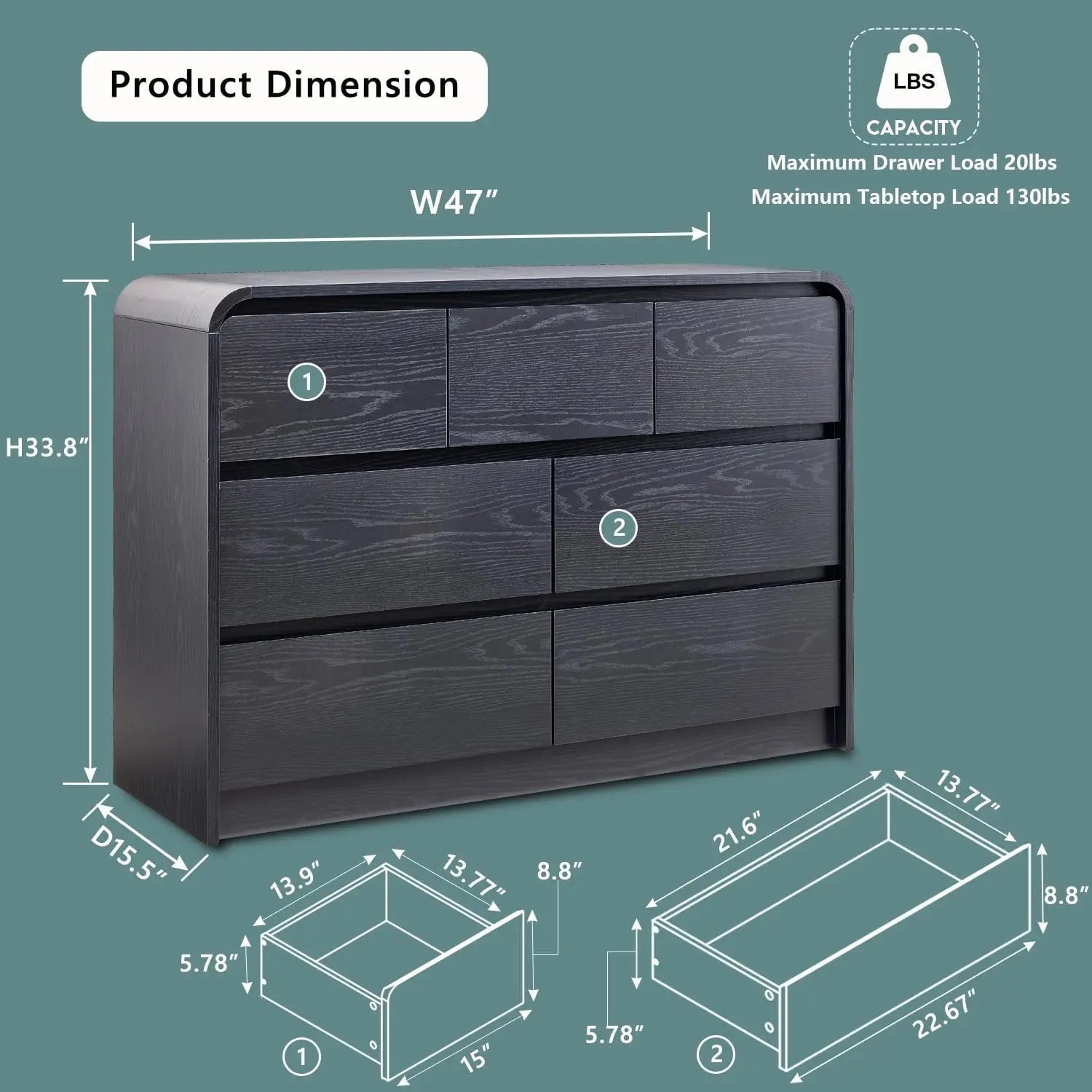 Modern 7 Drawers Dresser, 47" Wide Wood Dressers & Chests of Drawers w/Curved Profile, Mid Century Modern Dresser.