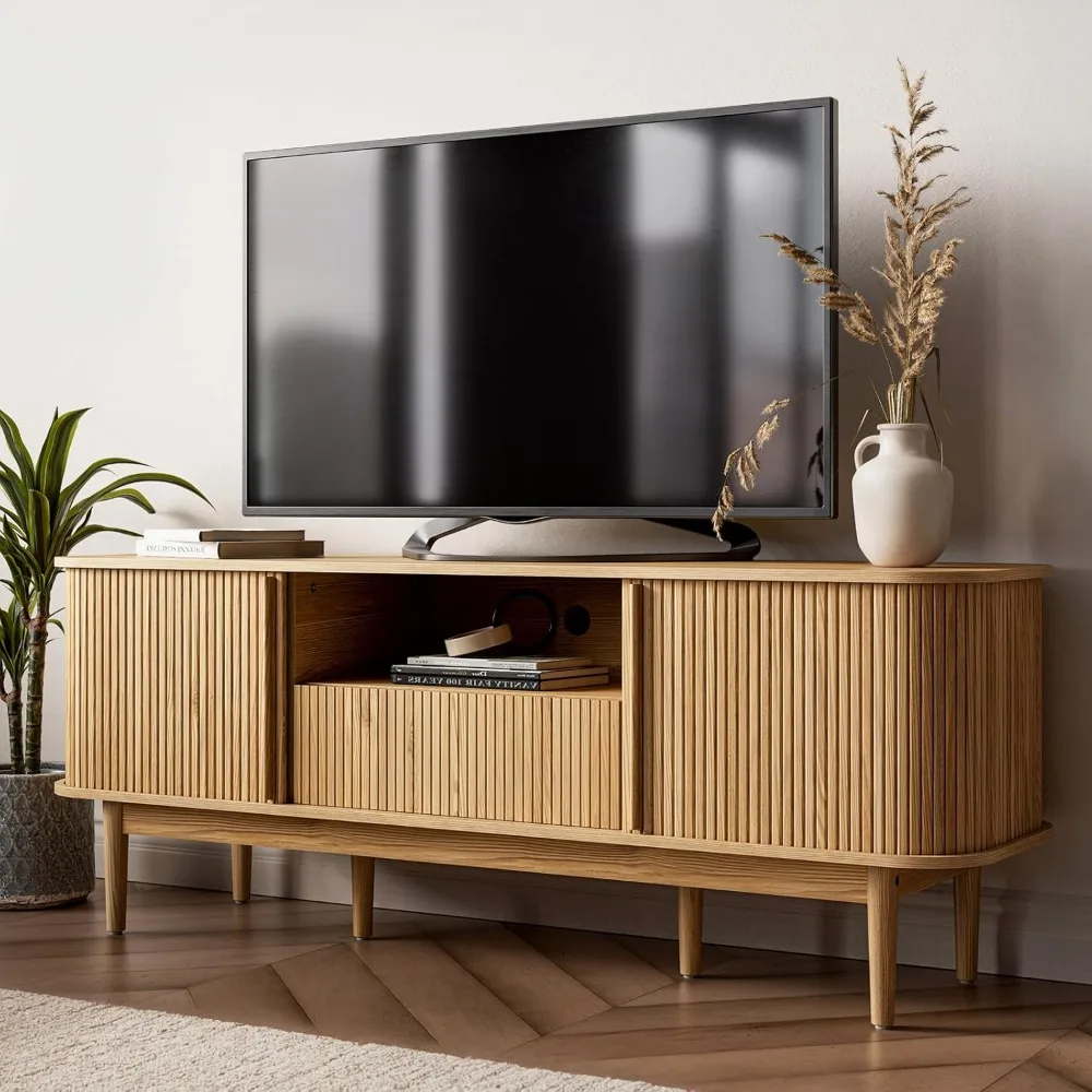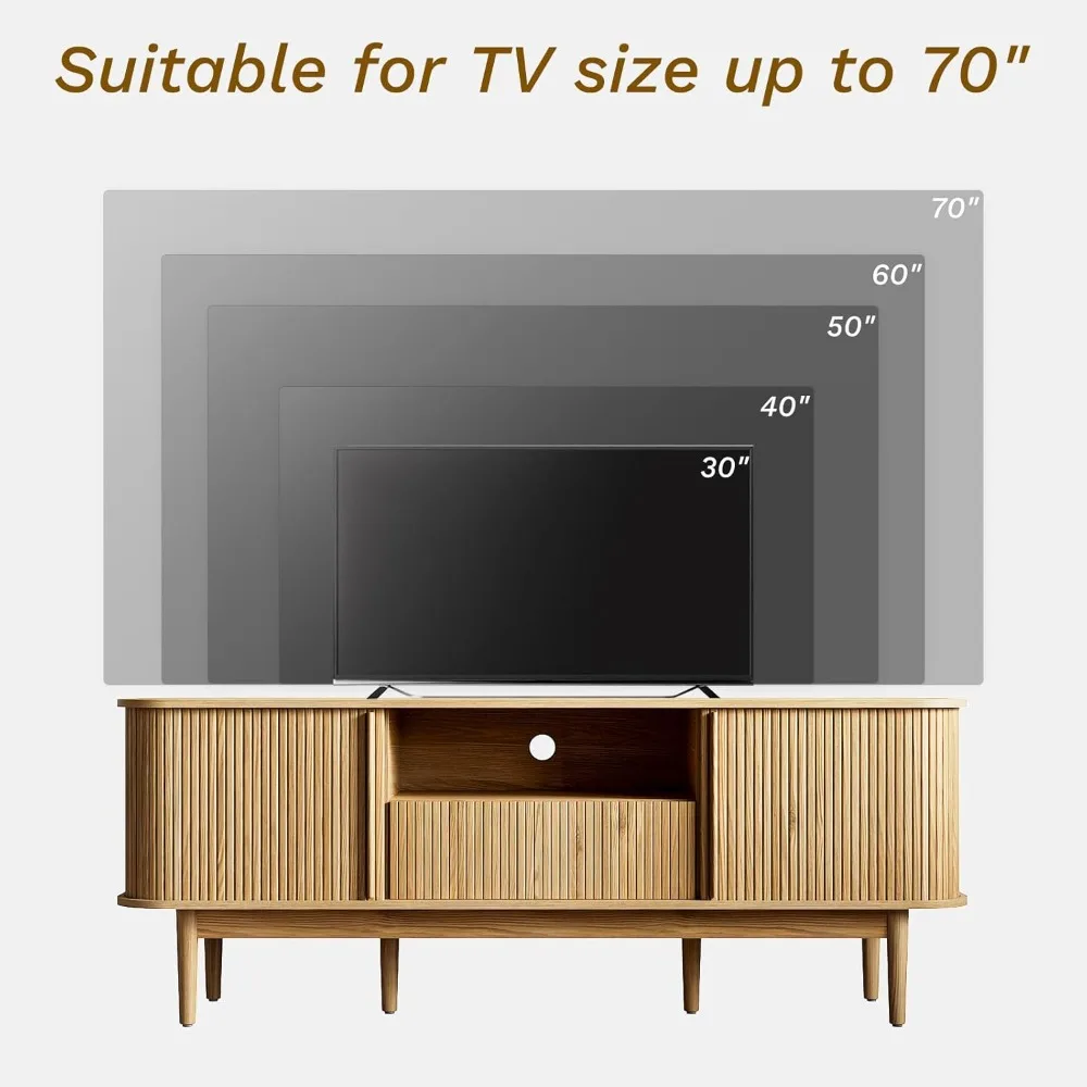 - Modern Design: Designed with smooth curved edges and clean lines, the natural TV stand adds a modern and cozy feel to your living room. Featuring sliding doors and a fluted panel design to make a statement.