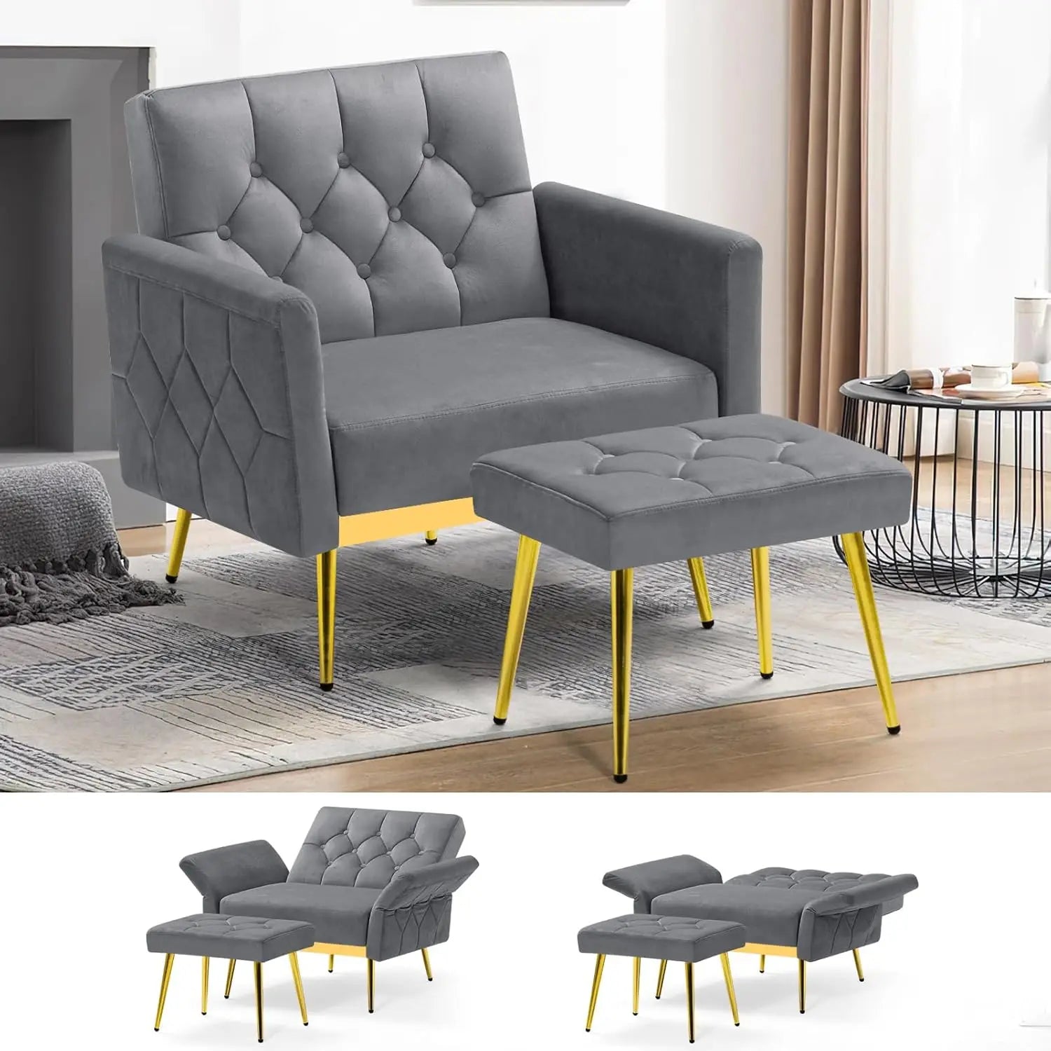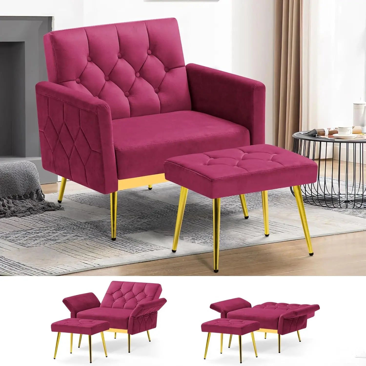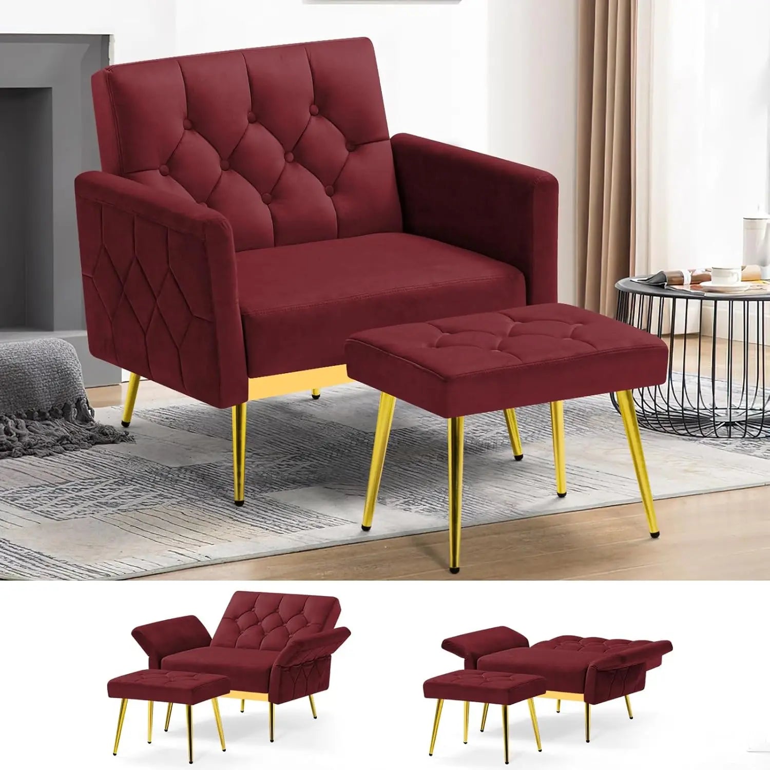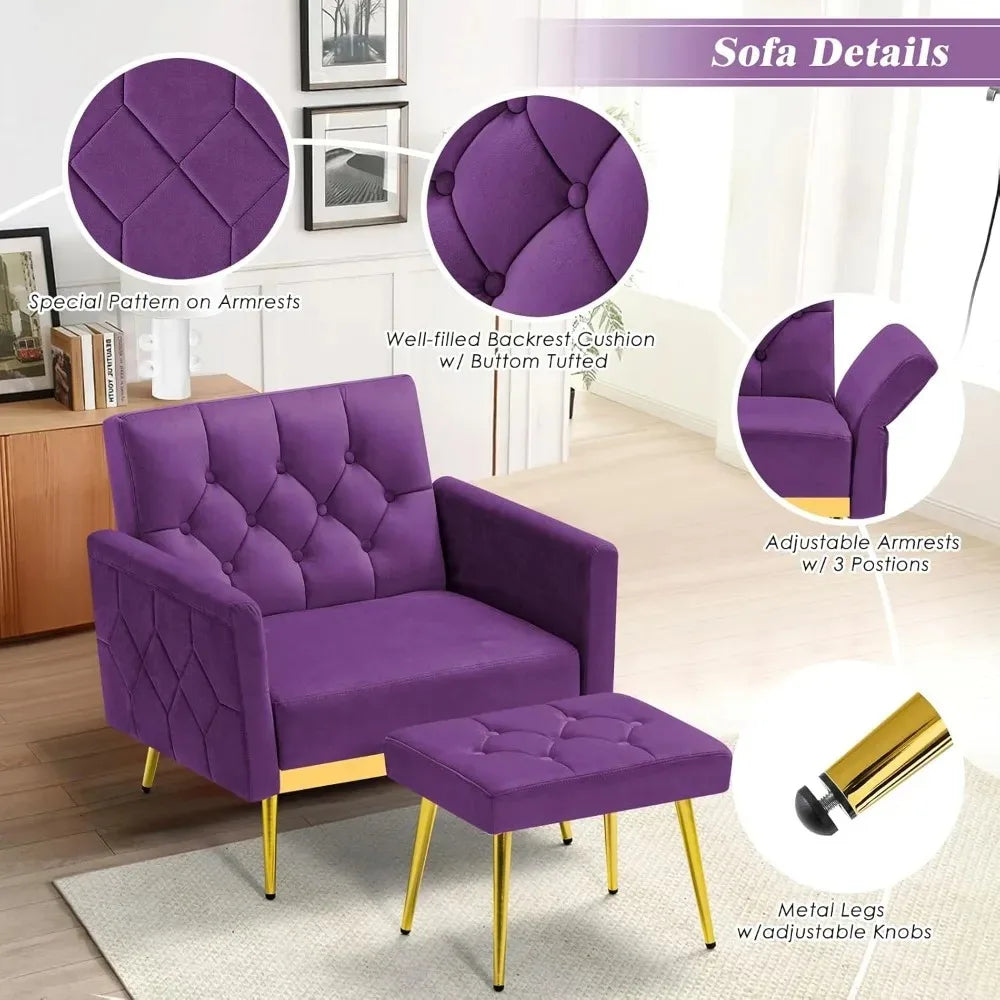 Velvet Accent Chair w/Adjustable Armrests and Backrests, Tufted Single Sofa with Ottoman, Upholstered Reading Chiar for Living R