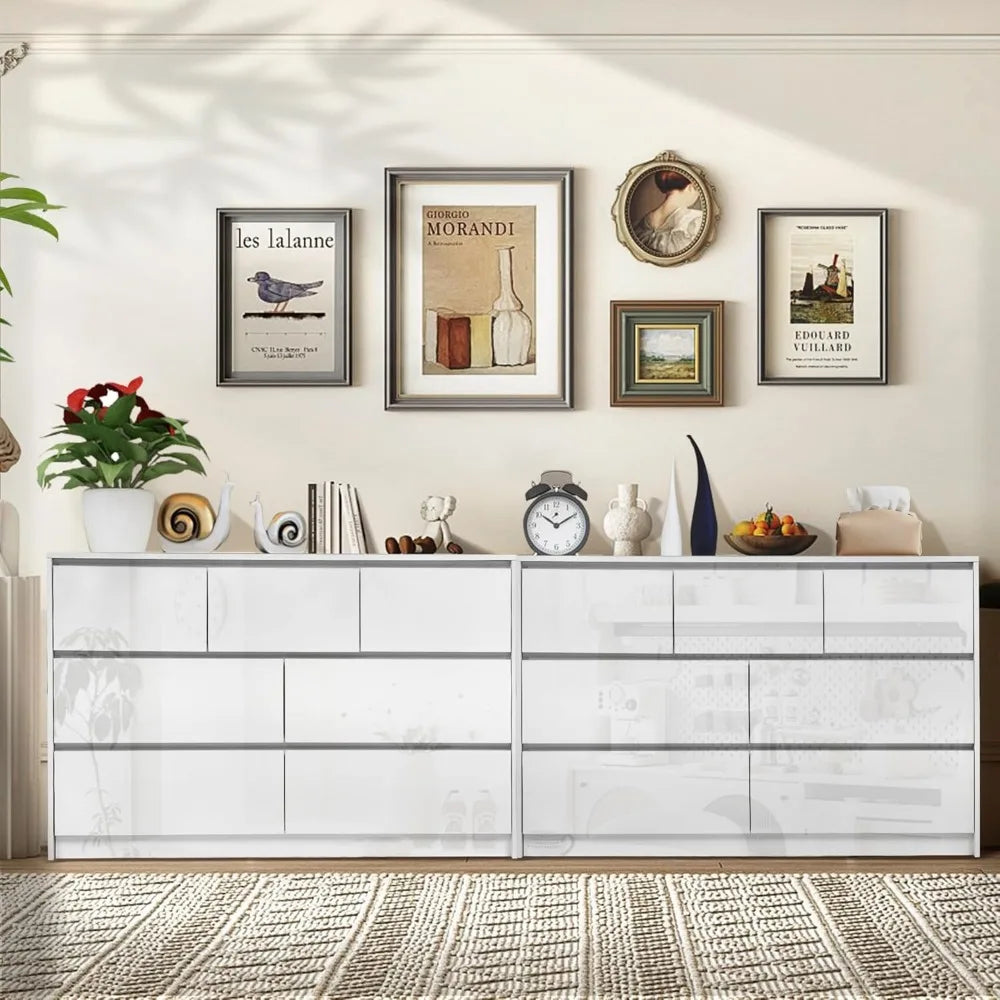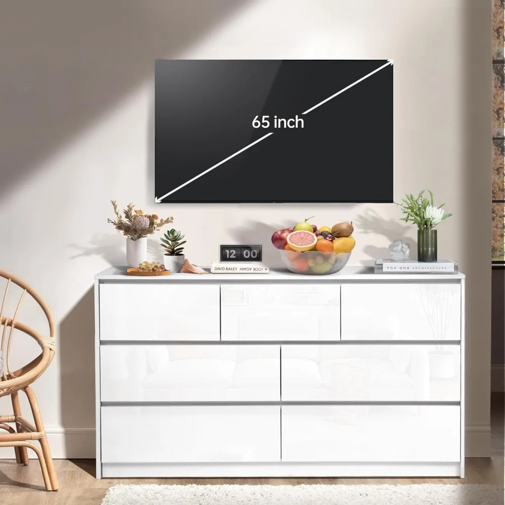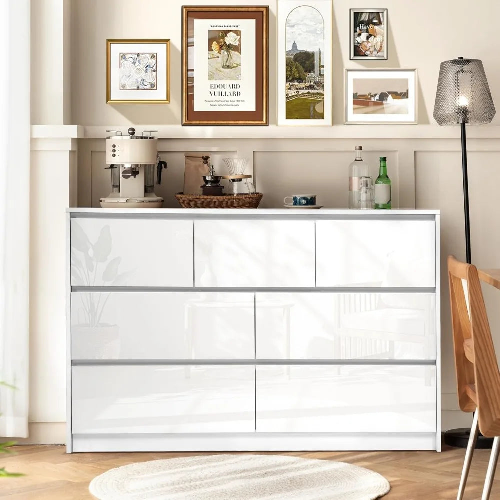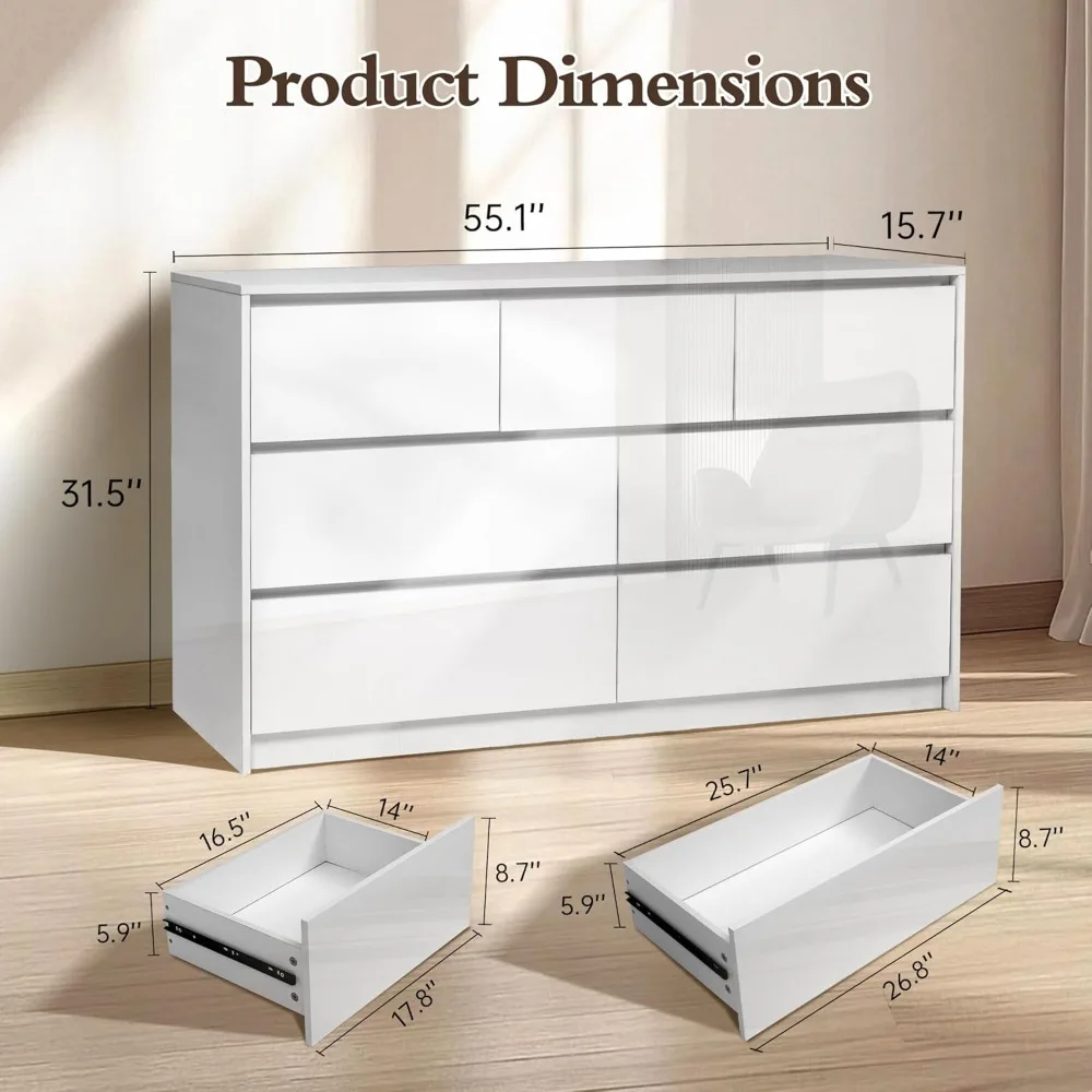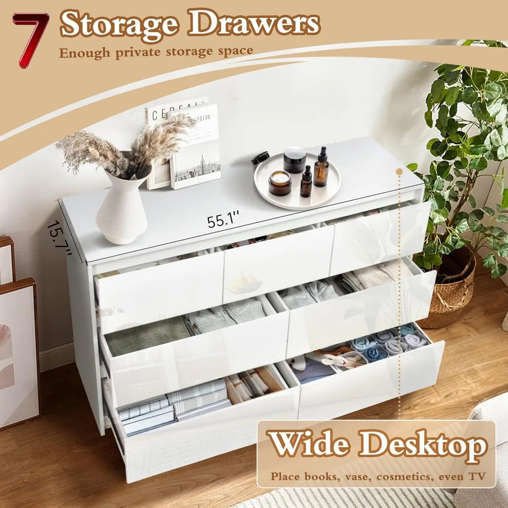 - Glossy handle-less design: Our white glossy 55 inch 7 drawer bedroom dressers features a unique stylish handleless design and high glossy surface combines modern minimalist design and practical storage space, adding functionality and style to your room