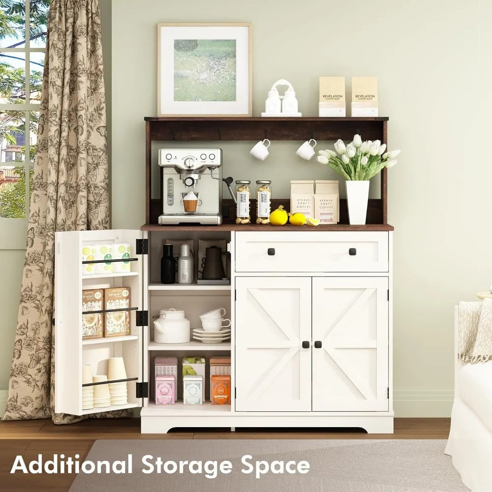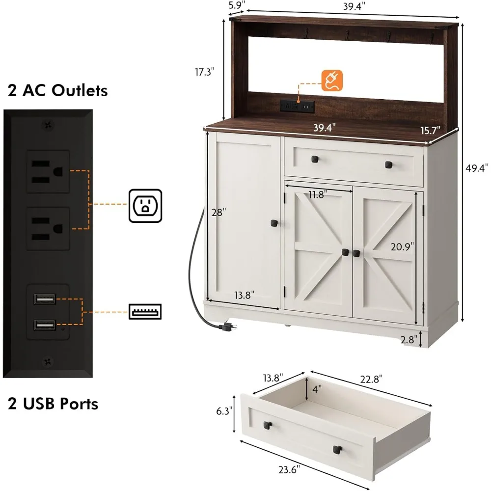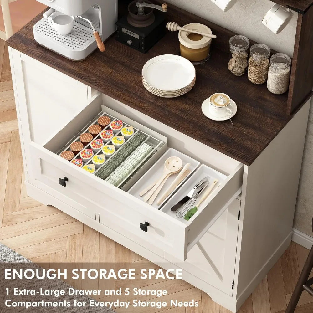 Wnutress Farmhouse Coffee Bar Cabinet with Drawer, 39" Kitchen Hutch Sideboard Buffet Cabinet with Charging Station and Adjustab